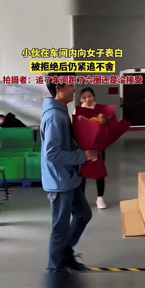 车间里,一名小伙手捧红包装束的鲜花向女子表白,遭拒绝后依旧没有放弃,在车间里追着女子跑了六圈,可女子始终没有接受这份心意。最后小伙停下脚步,神情落寞,整个人看着像是被抽走了精气神一般。 爱情本就需要双奔赴,对方心意已决,一味纠缠只会让彼此为难。小伙追女生 男同事表白