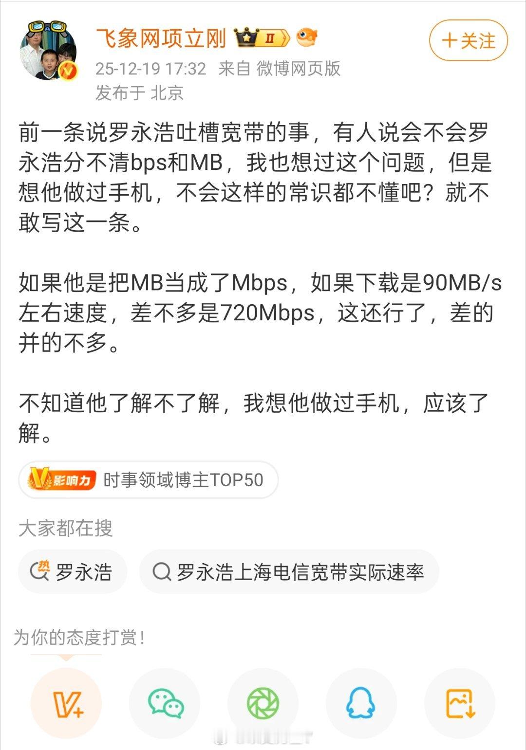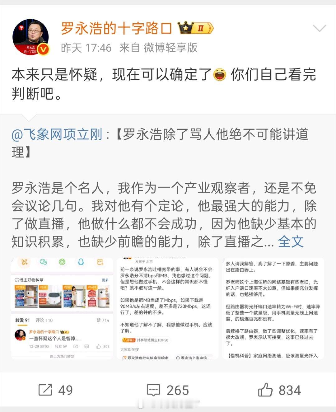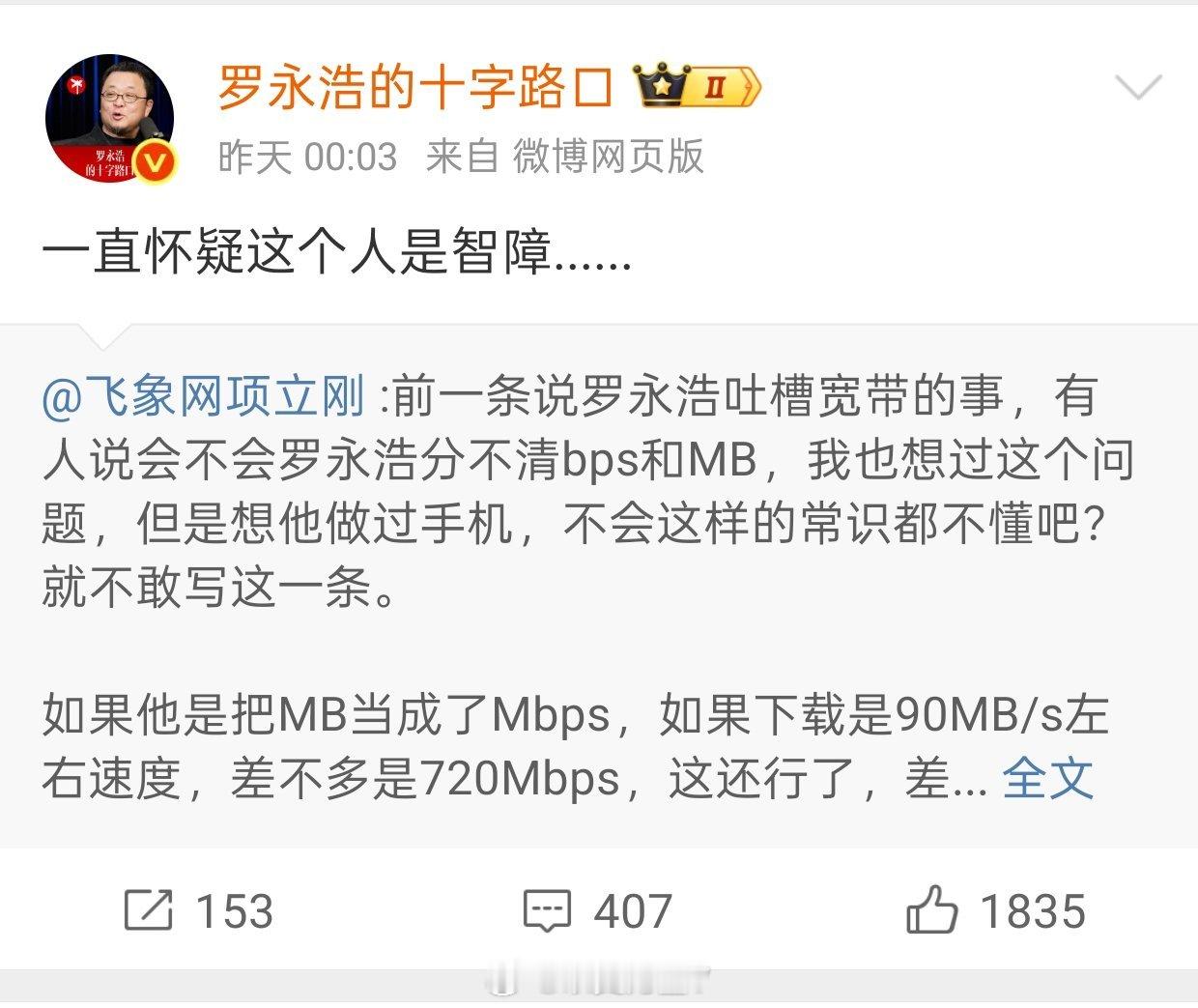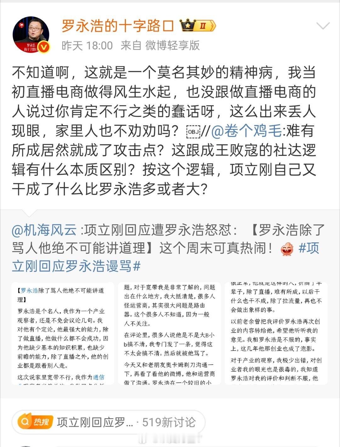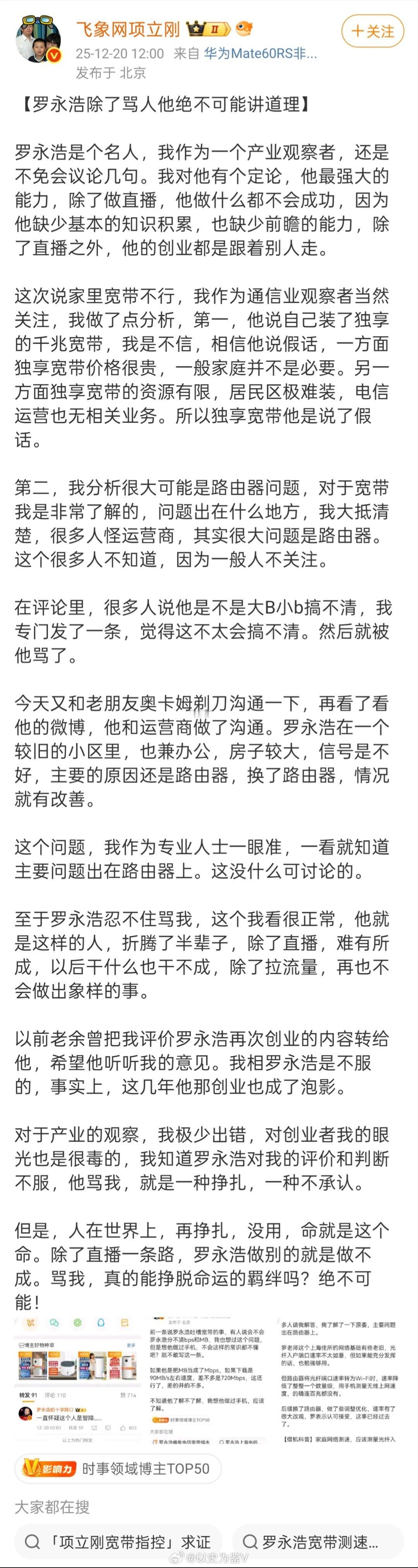 罗永浩痛批电信宽带缩水项立刚回应罗永浩谩骂 本来是关于电信宽带的争论,没想到现在吵吵上了……罗永浩连着转发三条说项立刚是:“智障”/“本来是怀疑,现在确认了”/“莫名其妙的精神病”……项立刚则写了长文——【罗永浩除了骂人他绝不可能讲道理】嗯,我觉得要是项立刚投诉罗永浩人身攻击绝对一投诉一个准……咱继续吃瓜看戏热点观点