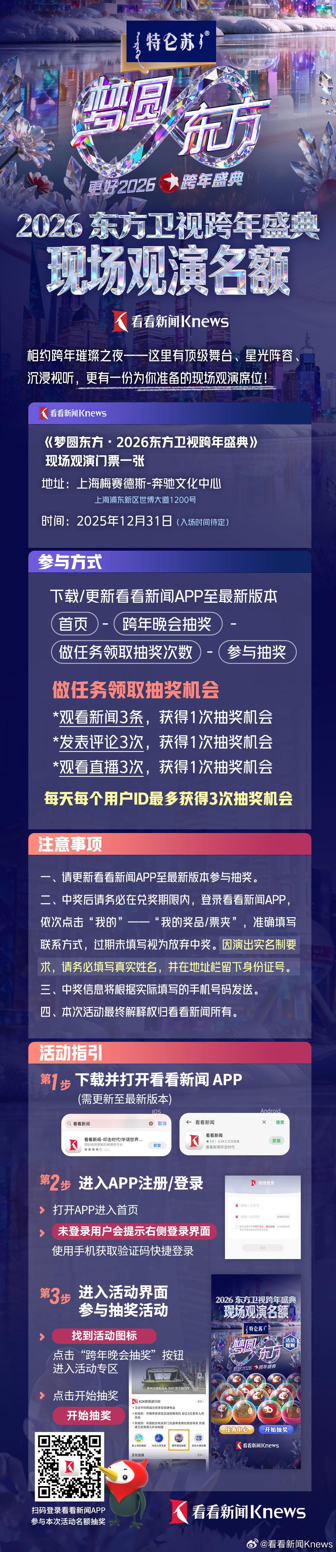 【🎁抽奖即将开启!直通2026东方卫视跨年盛典现场!】 #直击2026东方卫视跨年盛典#告别2025的最后钟声,即将在上海梅赛德斯奔驰文化中心敲响!✨2025年12月31日19:30,东方卫视跨年盛典与你相约璀璨之夜——这里有顶级舞台、星光阵容、沉浸视听,更有一份为你准备的现场观演席位!#东方卫视跨年#,向2026出发!【悄悄告诉你们,“看看新闻”APP上的抽奖活动已经开始咯!微博平台的抽奖将于周一(22日)10时准时开启】