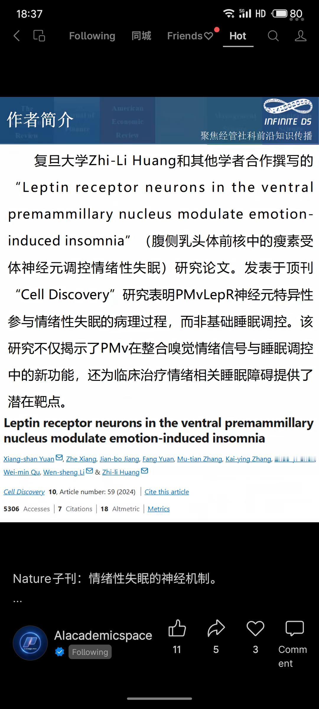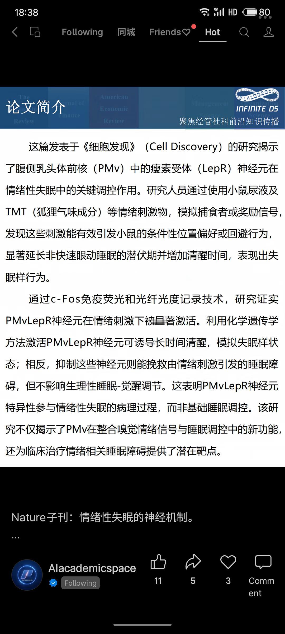 复旦团队在《细胞发现》发文,揭示大脑特定神经元(PMvLepR)专门调控情绪性失眠,为治疗情绪相关睡眠障碍提供新靶点。