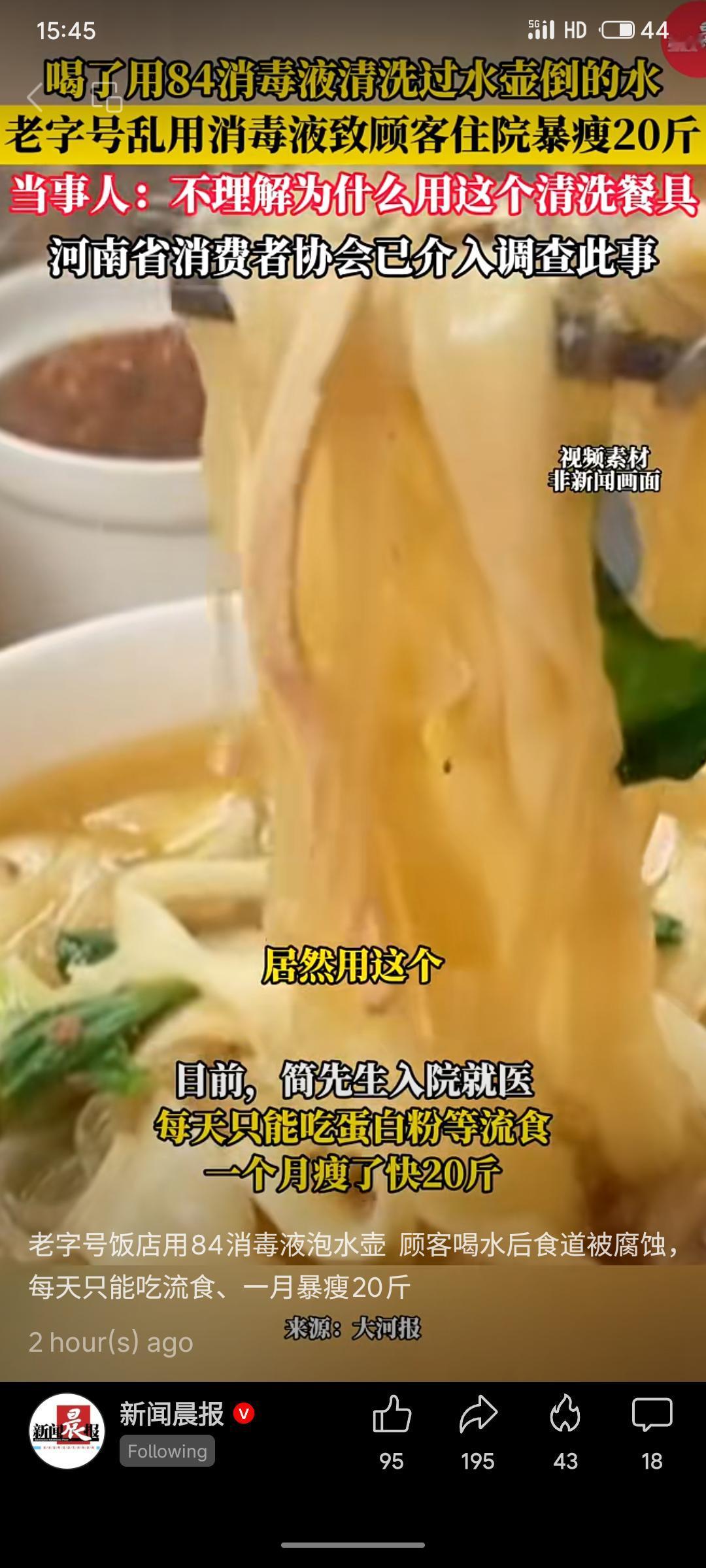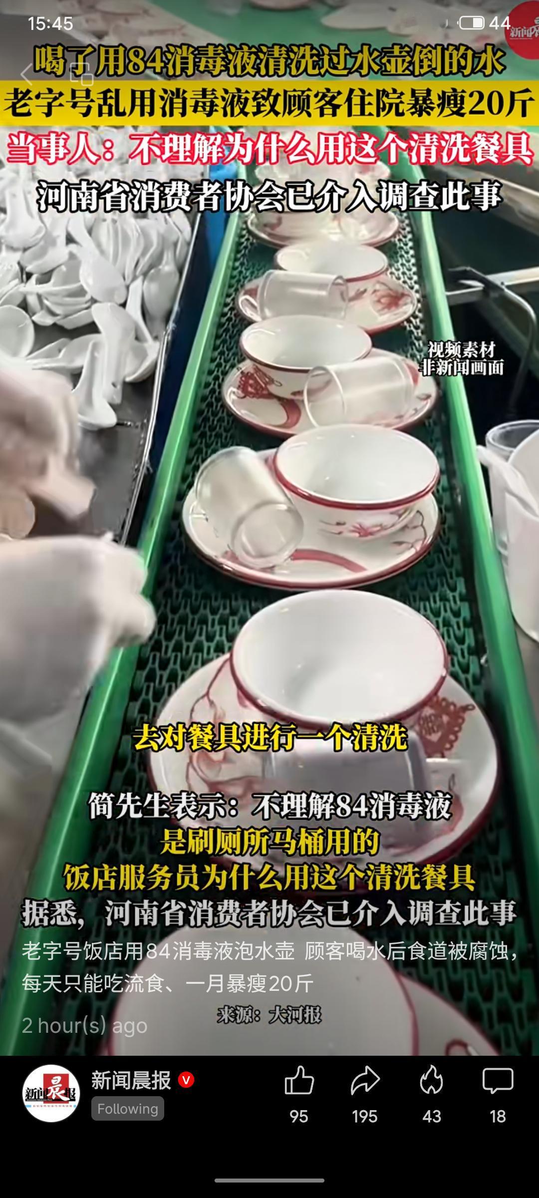 河南郑州一老字号饭店服务员误用84消毒液清洗水壶,顾客饮用壶中水后食道遭腐蚀,入院治疗。其每日仅能进食流食,一月内暴瘦近20斤。当事人对此表示不解与不满,目前河南省消费者协会已介入调查。