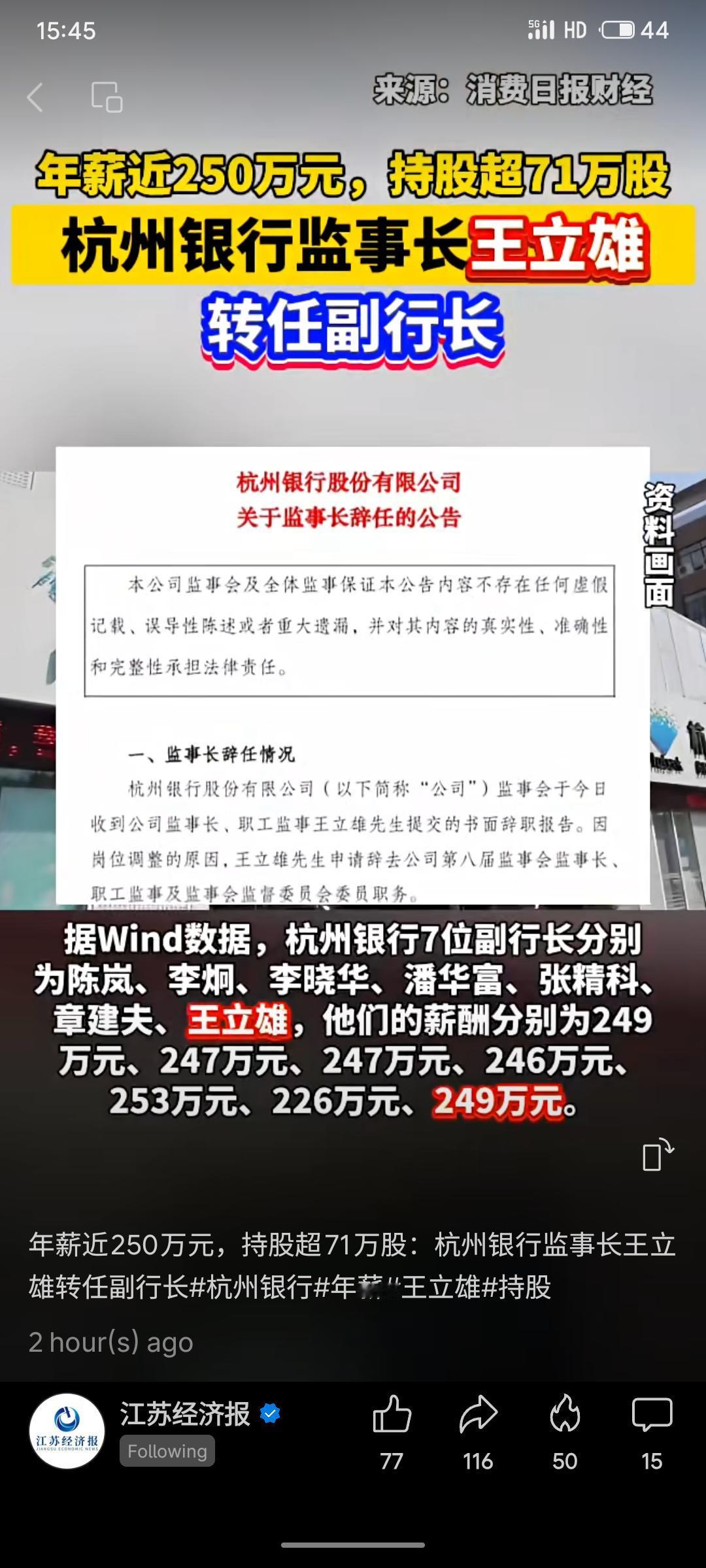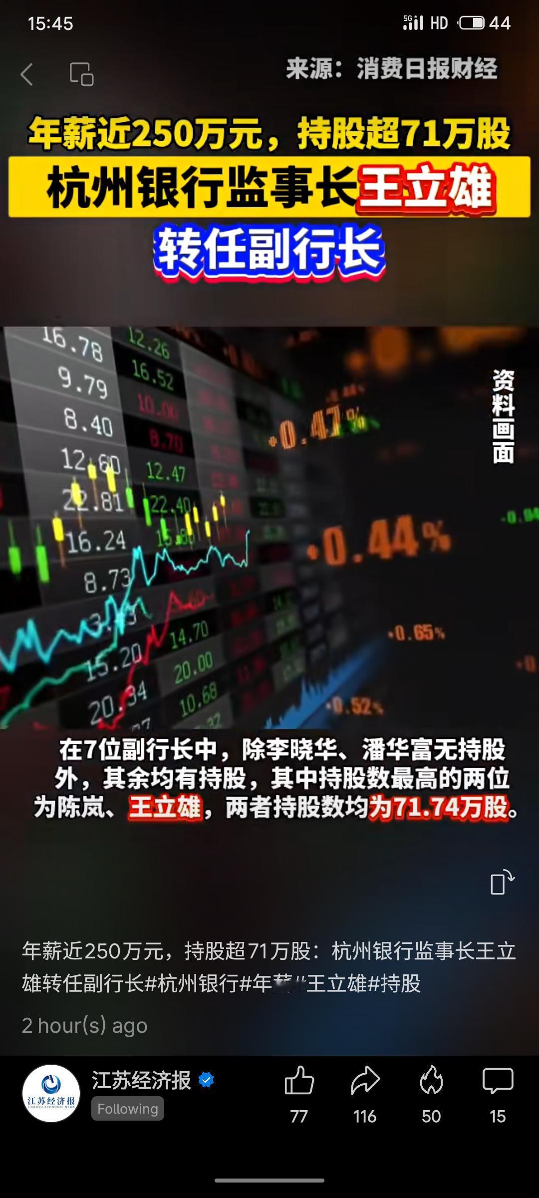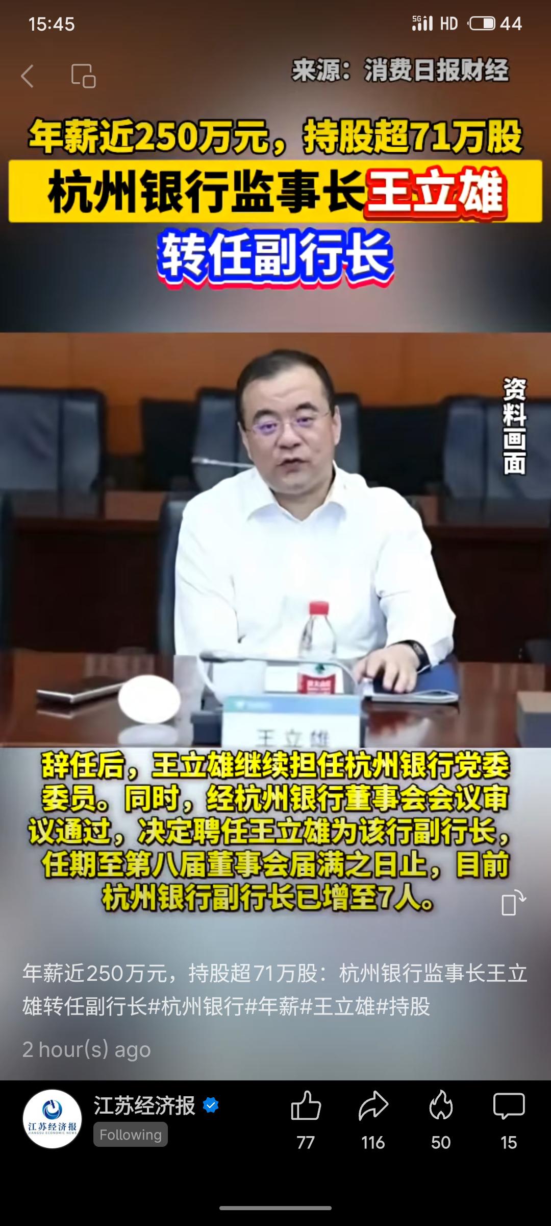 杭州银行监事长王立雄因岗位调整辞任,并转任该行副行长。其年薪近250万元,持有股份超71万股。此次调整后,杭州银行副行长增至7人,其中多数持有股份,王立雄与另一副行长陈岚持股数并列最高。