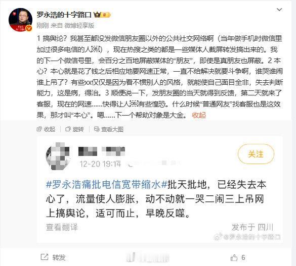 近日,罗永浩因一场“较真”的维权再次登上热搜。不过这一次无关创业或带货,而是替自己、也为千万网友,讨回了千兆宽带本该拥有的速度。12月21日,@罗永浩的十字路口 发文表示,此前吐槽的上海电信宽带问题已圆满解决,如今网速快得“令人惶恐”。这番回应直接将罗永浩反映的电信网速问题已解决 话题推上热搜榜单。 事件起因于几天前,罗永浩在朋友圈吐槽,自搬到上海后办理的“独享千兆宽带”,大半年实测网速始终停留在90多兆,仅为承诺速率的零头。更令他困扰的是维权过程陷入循环:联系官方客服、代理商甚至疑似内部人员后,问题仅短暂缓解,不出几天便恢复原状。最终他直言“再解决不了就网上发疯”,这番话瞬间激起众多用户共鸣。网友们纷纷晒出相似经历,吐槽网速缩水、高峰卡顿,相关话题阅读量迅速突破5亿。 转机出现在吐槽发出之后。据罗永浩描述,朋友圈发布当天即收到反馈,次日电信客服上门排查,最终发现问题是楼宇弱电井中光纤老化所致。更换配件并优化路由器设置后,实测网速跃升至九百多兆,完全达标。他调侃现在刷视频、传文件几乎无需等待,快到甚至有些“惶恐”,并特别说明自己的初衷很简单:既然付了千兆宽带的费用,就应享受到承诺的网速,并非刻意挑事。 这场维权中还出现一段插曲。通信行业大V项立刚发表质疑,认为可能是罗永浩混淆了网速单位,并暗指其不懂技术。此举引发罗永浩强烈回击,双方你来我往,一度将维权讨论演变为口水战。但多数网友心里清楚:无论技术细节如何,用户付费购买服务,速率未达承诺就是运营商的问题,罗永浩的较真并无不妥。 更难能可贵的是,罗永浩并未止步于个人问题的解决。他在回应中特意呼吁,希望普通用户在遇到类似情况时,也能获得同等的客服响应效率,不必在反复沟通中消耗精力。毕竟大家都明白,他能迅速解决问题,多少受益于其公众人物的影响力;而普通用户维权时,往往面临举证困难、投诉流程繁琐的困境,多数人最终只能选择忍耐。 值得注意的是,罗永浩还预告了下一个协助对象——“大金”。据悉,他家中七台大金中央空调的年度维护费高达1.5万元,且曾遭遇客服态度问题,目前已在跟进处理。网友见状纷纷调侃:“罗老师这是要转型‘消费者维权代言人’了,建议各大品牌赶紧自查整改。” 这场风波实则揭示出一个行业痛点:无论是宽带速率缩水还是售后响应迟缓,消费者维权都不应依赖“舆论发酵”才能推动解决。罗永浩的网速从90兆提升至九百多兆,证明问题并非无法解决,关键在于是否给予足够重视。希望此次事件能为相关行业带来警示,彻底摒弃“区别对待”的服务模式,让公众人物与普通用户都能享受到同等高效、专业的售后响应。毕竟,真正靠谱的服务,才是一个品牌最该拥有的“高速通道”,不是吗? 来源:星视频