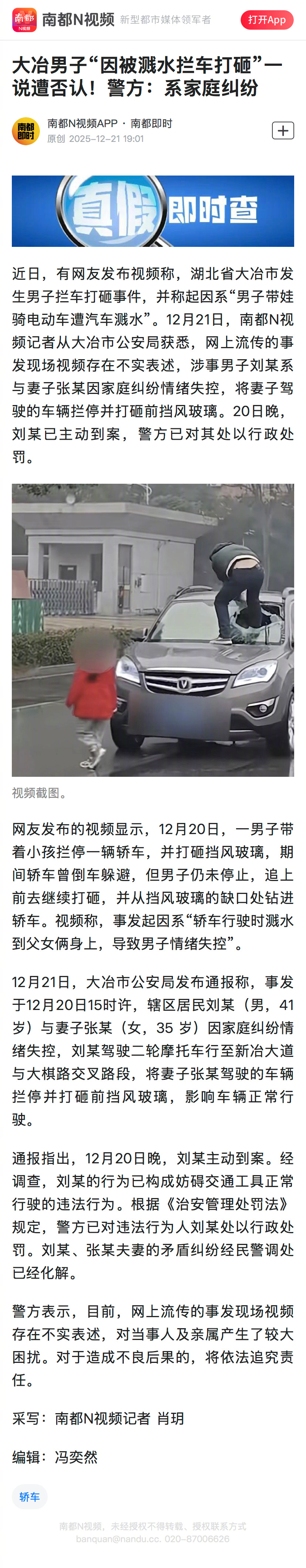 #网传轿车溅水致拦车打砸实为家庭矛盾#【大冶一男子拦停轿车打砸!警方称系因家庭纠纷,已行政处罚】#男子因家庭纠纷砸妻子轿车被处罚##警方辟谣大冶男子拦车打砸原因#近日,有网友发布视频称,湖北省大冶市发生男子拦车打砸事件,并称起因系“男子带娃骑电动车遭汽车溅水”。12月21日,南都N视频记者从大冶市公安局获悉,网上流传的事发现场视频存在不实表述,涉事男子刘某系与妻子张某因家庭纠纷情绪失控,将妻子驾驶的车辆拦停并打砸前挡风玻璃。20日晚,刘某已主动到案,警方已对其处以行政处罚。南都N视频记者 肖玥