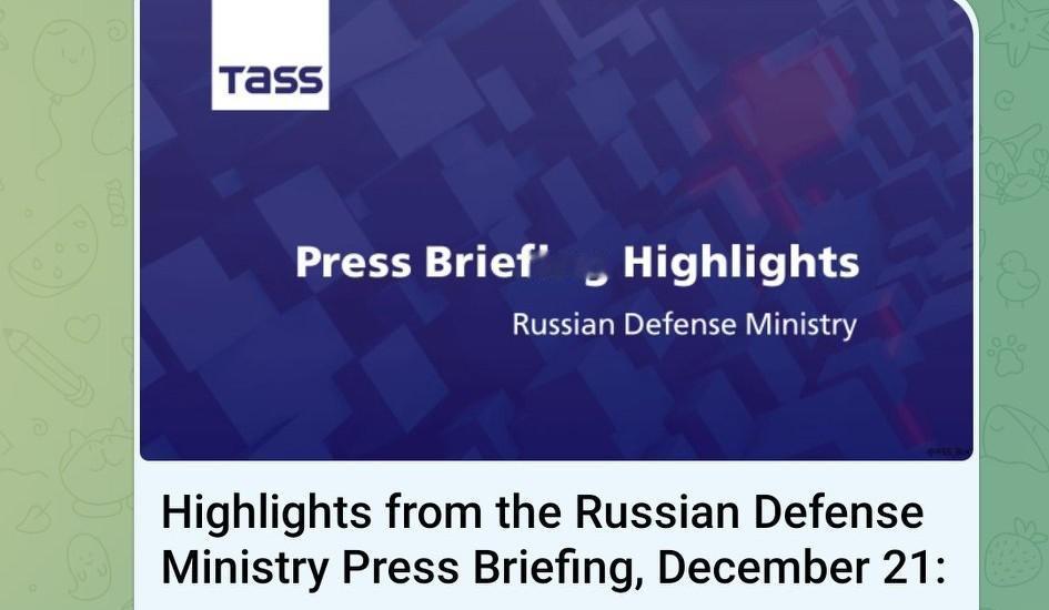 俄罗斯国防部12月21日新闻发布会核心要点如下👇 ▪️ 俄罗斯武装力量 🪖(armed forces)正在歼灭顿涅茨克人民共和国季米特罗夫地域的被围敌军,对罗丁斯科耶地区溃散的乌克兰军队作战单位展开清剿行动。 ▪️ 过去24小时内,乌克兰武装力量在中央作战集群责任区,损失了美制艾布拉姆斯坦克以及德制豹式坦克。 ▪️ 在俄罗斯武装力量的军事行动打击下,乌军过去24小时内已损失约1285名作战人员,作战力量受损严重 ⚔️(forces)。