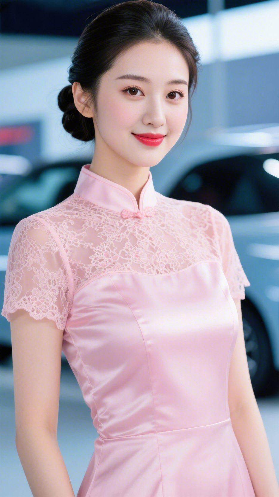 粉襟雅意浸柔光 展厅的光揉作软纱,落于她身时,粉旗袍便裹了雾般的柔。蕾丝襟领织着细碎花影,盘扣是淡粉的结,缎面泛着轻浅光泽,似把春樱的软意藏进了衣料里。 发鬓挽得舒展利落,唇色是匀开的绯色,抬眸时,连背景里的冷调陈设都漫开温意。原来传统与现代从不是相悖的韵,是有人把旗袍的雅揉进了当下的光影里,站在那里,便成了日常中漾开的温柔底色。 新中式穿搭 雅致氛围感