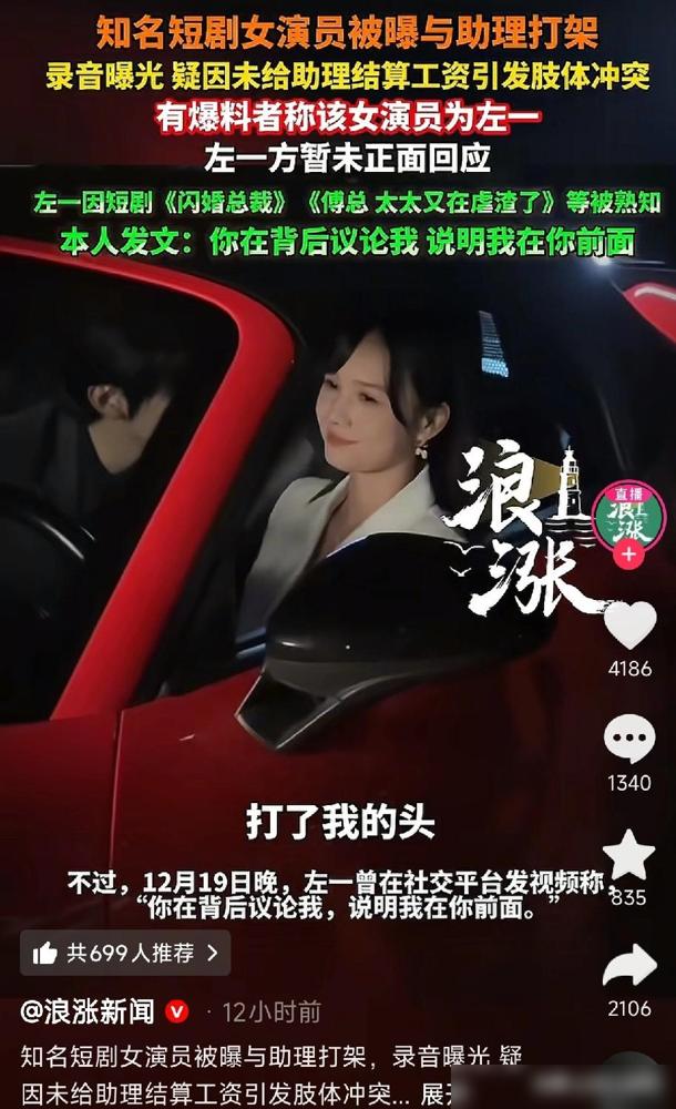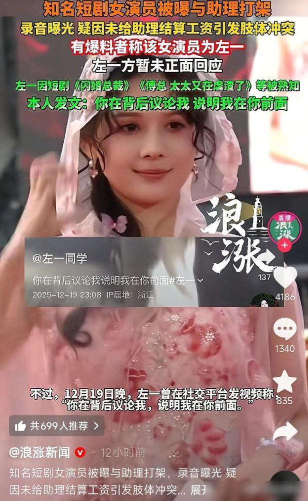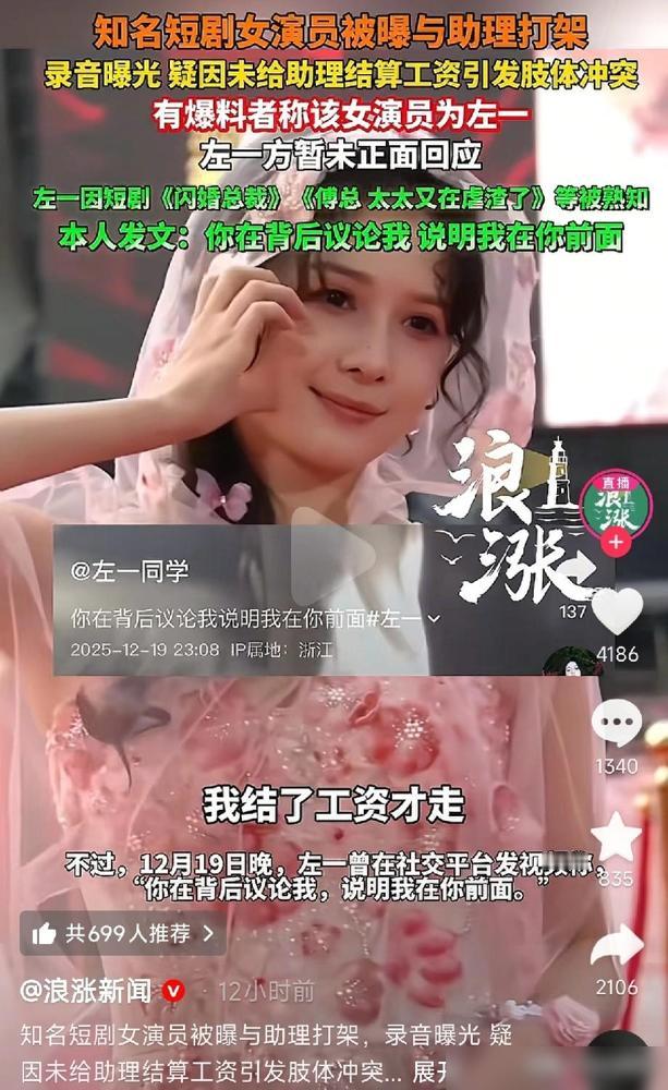 短剧女演员左一拖欠助理工资5619.24元。 听了相关录音 左一怒喝:“滚出去!” 起因其实就是这个助理在讨要被欠的工资,结果不但没拿到钱,听录音里两人的对话,助理好像还遭到了对方的推搡和殴打。 说实话,看到那个甚至精确到分位的5619.24元,我就觉得挺讽刺的。为了这点辛苦钱去难为一个整天帮自己干杂活的人,这心是有多狠。 最让我心惊的是那句“你有什么证据”,这种仗着私下场合没被拍到就敢随意对待他人的傲慢姿态,真的太败路人感了。 感觉现在的短剧圈门槛可能真的偏低,有些演员还没怎么大红大紫呢,就开始学着摆那种旧社会的“主子”架势,连基本的契约精神都没了。 身为一个公众人物,如果不明白最起码的尊重为何物,演再多戏大概也难以赢得观众长久的认可。 估计这波事情闹出来后,她的口碑是真的很难救回来了,毕竟这种对弱势劳动者的欺凌最让普通人反感。 总之这种事一旦成了标签,以后每当她出现在屏幕上,大家大概率只会想起这段不堪的讨薪录音。 说到底在演艺圈混,演技固然重要,但做人的底线要是没了,职业生涯恐怕也就到头了。