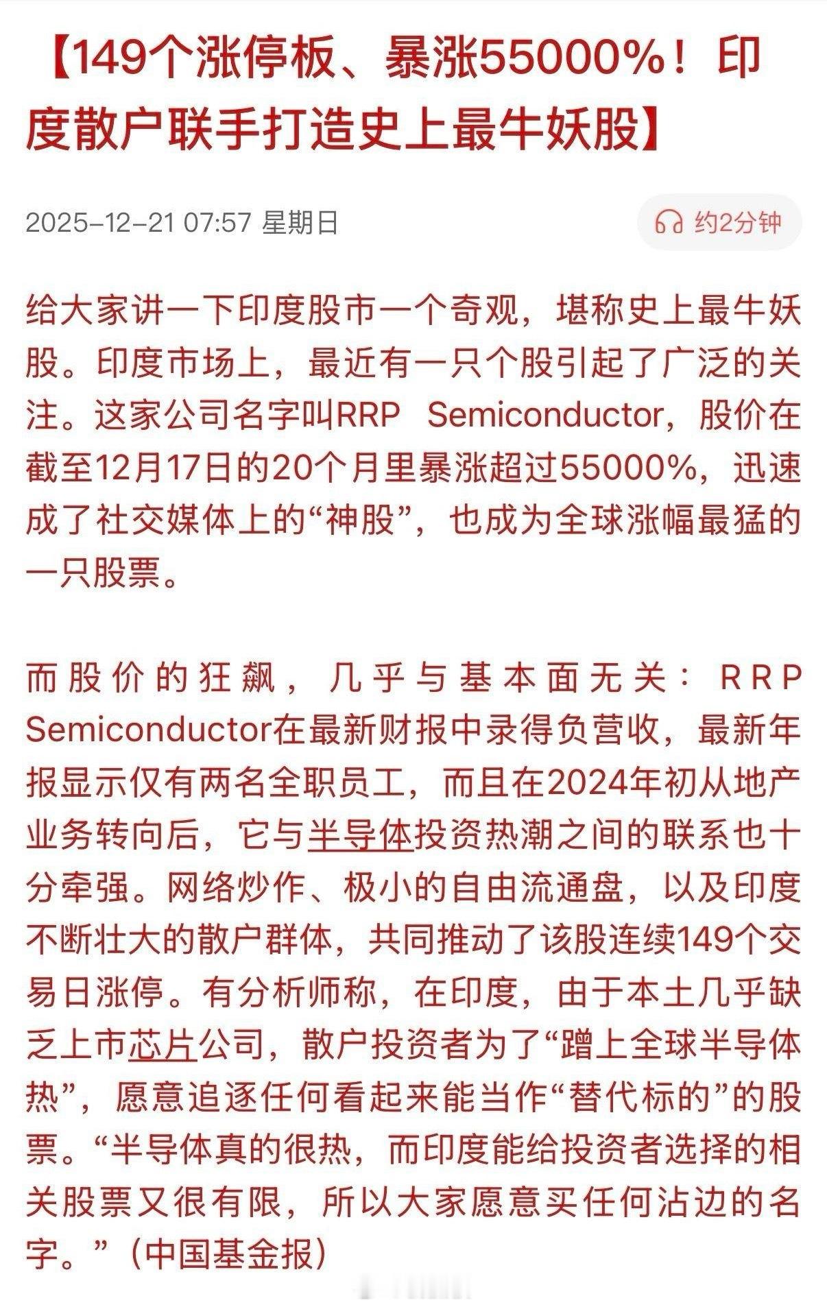 全球唯独印度股市里可以诞生出“神股”,一个股票涨了149个涨停板,在20个月里爆涨55000%,任何市场任何时期都没有出现如此疯狂的炒作,神奇的印度总能整出世界上最为“神化的上涨”。印度股市是全球投资者都想投资的市场,只准涨不跌市场,在过去十年间印度股市从26117.54点涨到2025年12月20日的85632. 68点,涨幅高达228%,年化约12.5%,比起全球任何一个市场都好。不知道印度使用了什么魔法,还是印度政府对股票市场的法律和制度执行严格,让市场没有财务造假和操纵市场等违法违规的各种乱象。印度股市是值得我借鉴的市场,造富创富从这里开始!