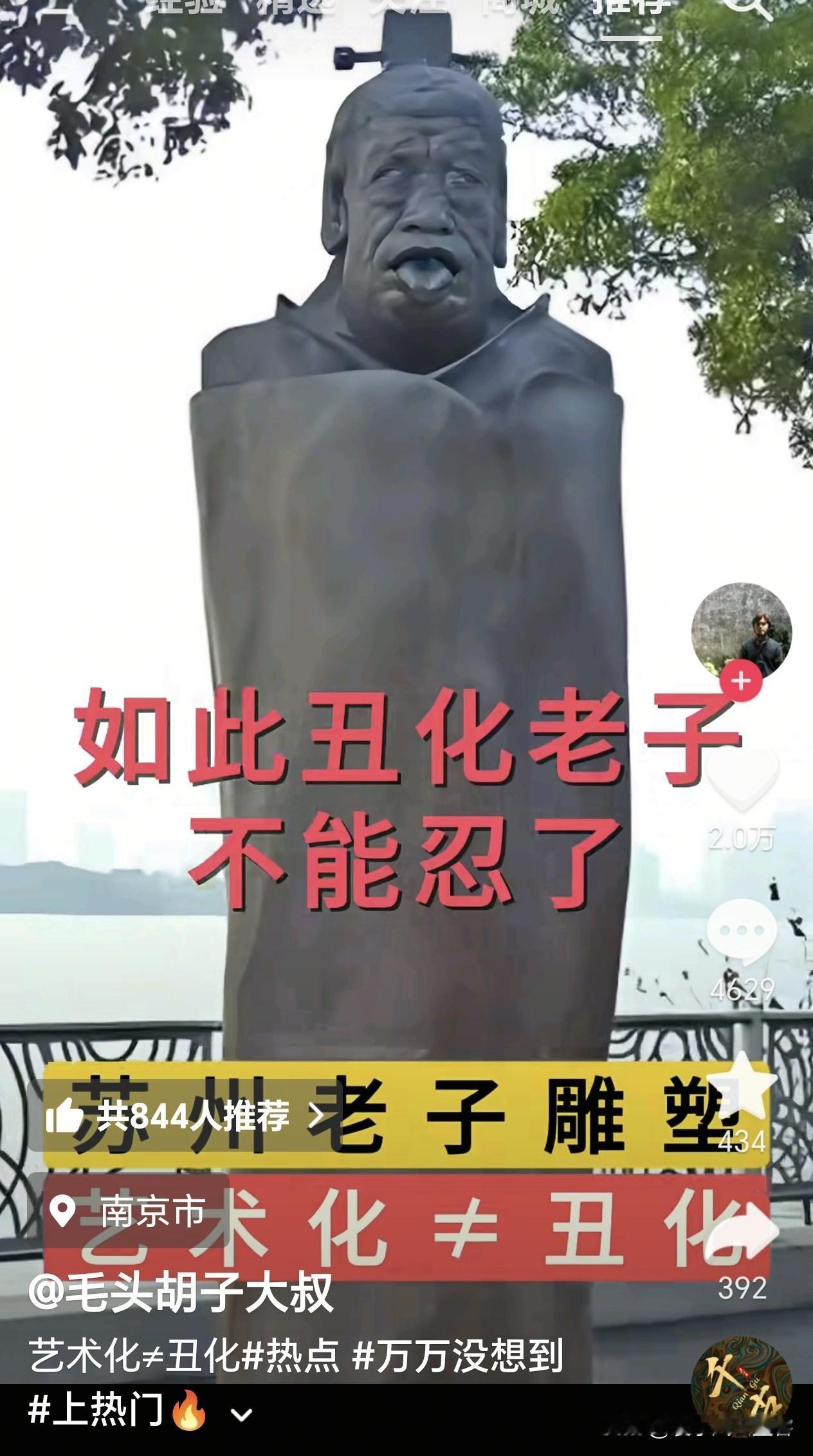 是哪个黑了心的敢如此丑化“老子”? 这尊“老子雕像”在南京定淮门的长江边,2011年左右立起来的。当时说要搞“长江文化带”,想用老子雕像添点文化味,结果这造型,真是一言难尽! 你看这雕像,老子吐着舌头,脸上的线条歪歪扭扭的,完全不像咱们印象里“仙风道骨、庄重沉稳”的老子,反倒像个“搞笑表情包”!有网友吐槽:“这是老子还是卡通怪兽啊?吐舌头是几个意思?难道是在玩‘吐舌挑战’?” 创作的人说,这吐舌头是参考“老子西出函谷关”的传说,想表现“大道至简”。但咱们都觉得,这也太“雷人”了!艺术创新可以,但也不能把老祖宗的经典形象整得这么奇怪吧?