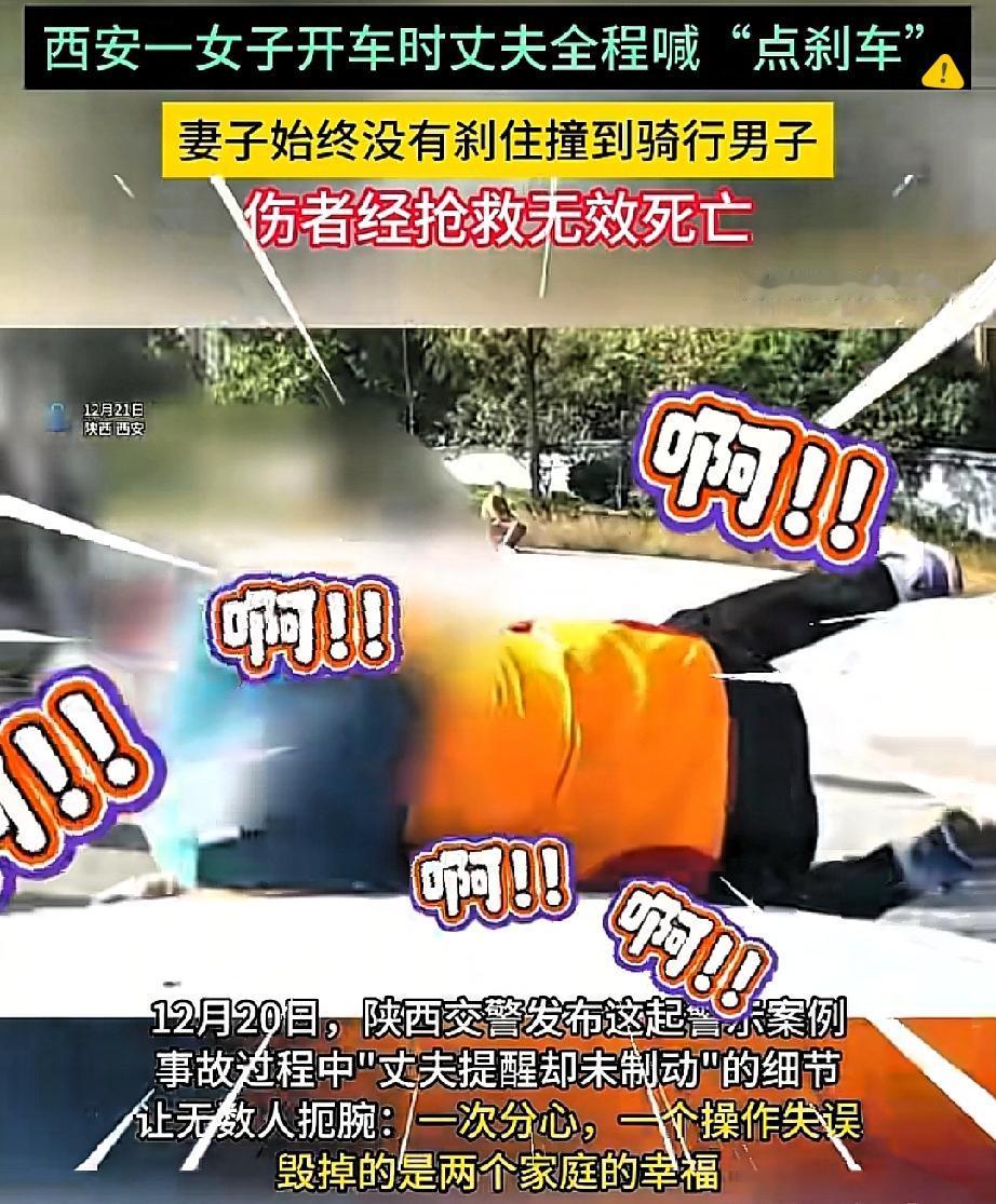 丈夫嘶吼“点刹车”都没用!陕西这场车祸,真不是“新手”俩字能洗白的! 女司机操作不当撞死人,全程伴随着副驾丈夫的焦急呼喊,可悲剧还是没能避免。 这事儿看着是操作失误,实则暴露了两个致命问题:新手对车辆的掌控力不足,还有副驾的错误提醒方式。 很多人觉得“熟练人员陪同”就万事大吉,却忘了慌乱时的嘶吼只会让新手更懵。 其实副驾该做的是沉稳指令,甚至能手动挂空挡、拉电子手刹避险。 而且65%的事故都源于不良驾驶习惯,新手别刚拿证就敢闯车流密集路段。 开车从不是“会开就行”,而是要对自己和他人的生命负责。 所谓的驾驶经验,本质就是预判危险、应对突发的能力。 你们觉得新手最该先练的是技术,还是应急反应?