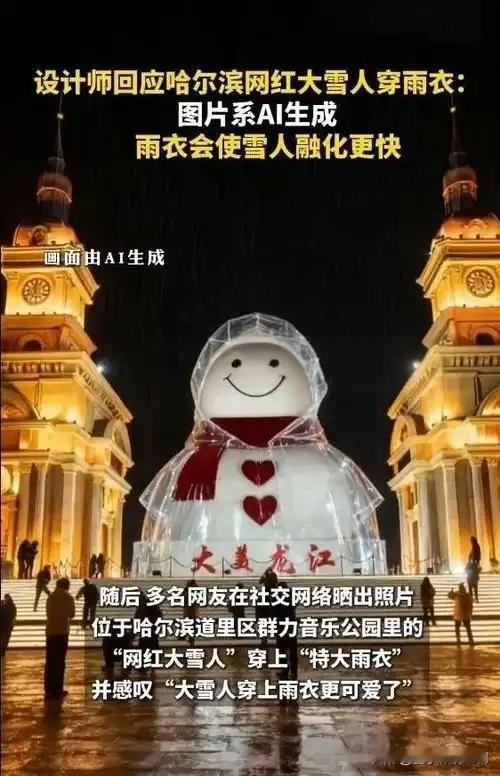 哈尔滨网红大雪人“穿雨衣”?实为AI创意闹乌龙 12月19日,哈尔滨雨雪交加,有网友晒出群力音乐公园网红大雪人“穿雨衣”照,引发关注。20日,设计师李秋实辟谣,此图系AI生成。若真给雪人穿雨衣,空气不流通会加速融化。这场乌龙虽是虚惊一场,却也展现出大众对大雪人的喜爱,AI创意也为冬日增添别样趣味。