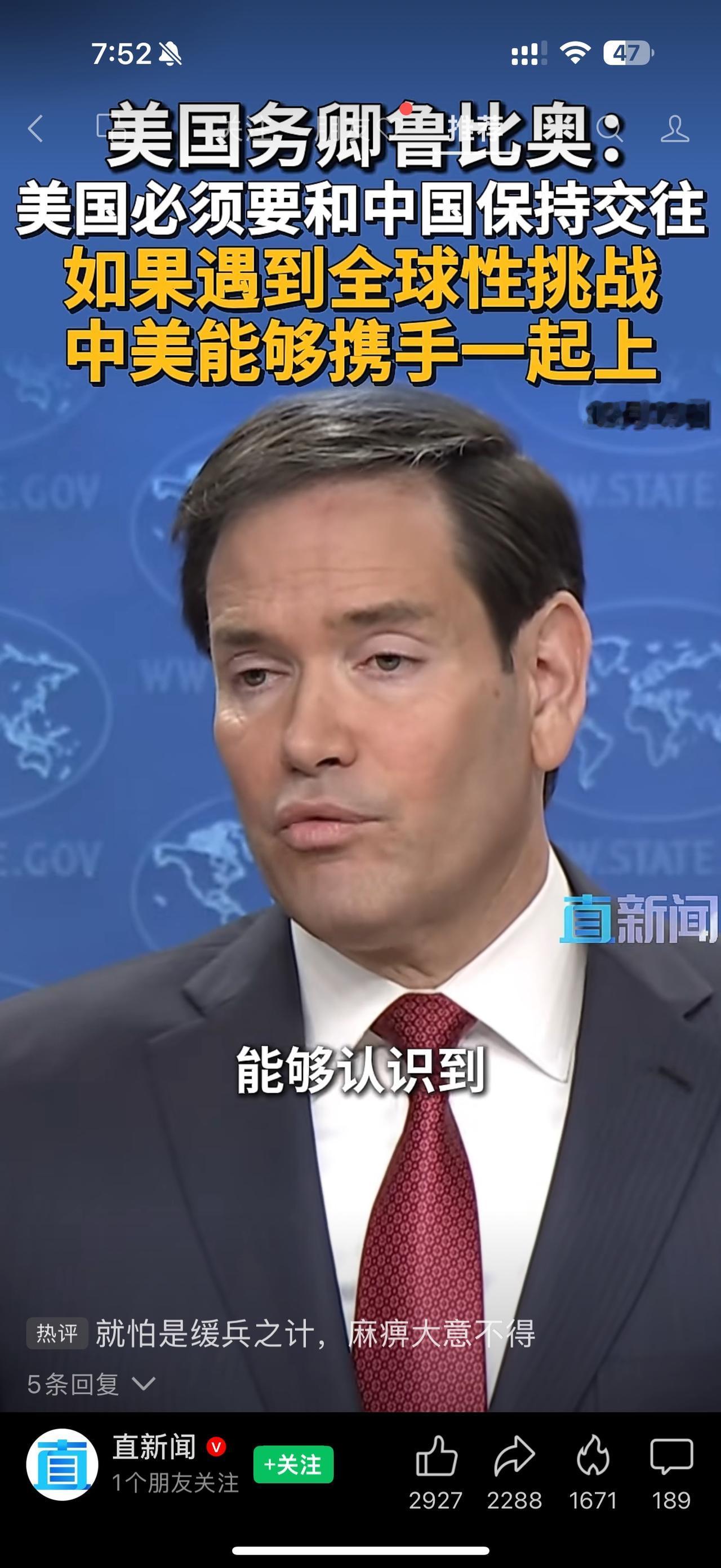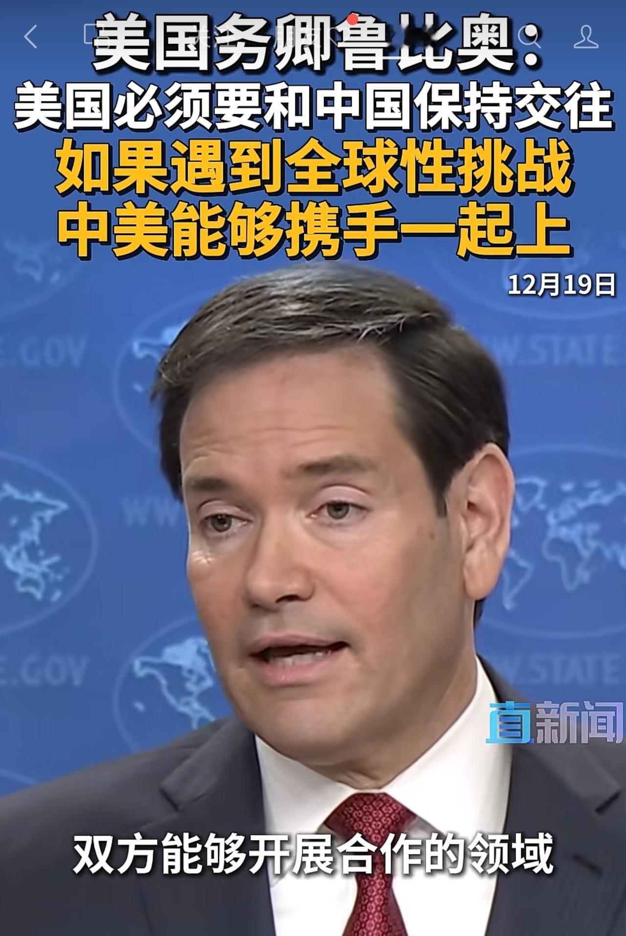这是太阳从西边出来了吗?美国国务卿卢比奥竟然近日罕见狂赞中国! 他说中国是一个强大富裕的国家,美国必须与中国保持密切交往,中美两国如果遇到全球性挑战,就可以一起携手解决! 这个卢比奥以前可是非常反华的人,我们国家还对他制裁了,不让他到中国,现在嘴巴和抹蜜了一样,这么狂赞中国,又是国务卿,这番表白中国,嘴巴太甜了!大家对此怎么看? 卢比奥