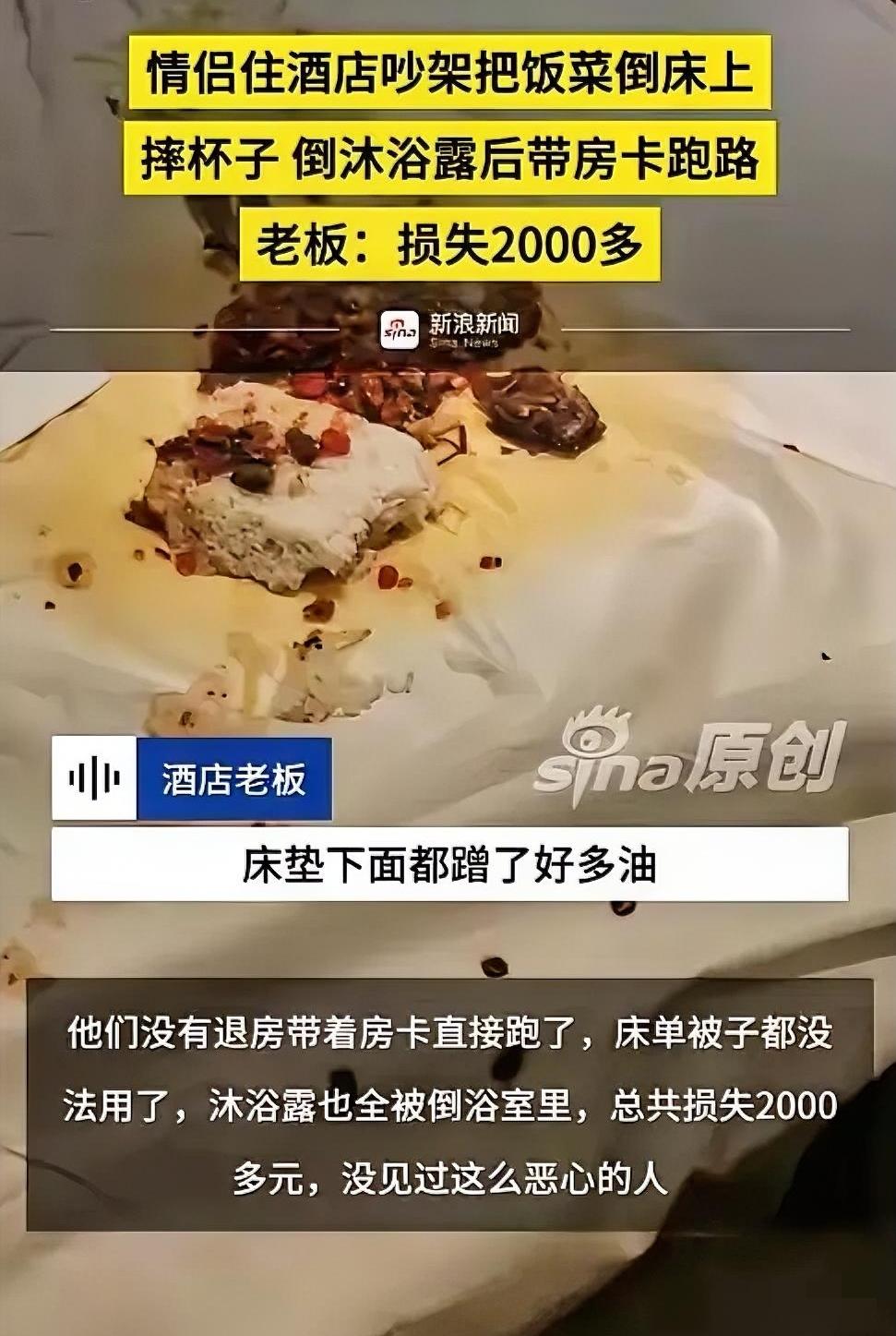 “必须严惩!”12月17日,湖南长沙,一对情侣入住酒店后,当晚就先后离开,随后再也没有回来,房卡也没归还,工作人员打开房门后,发现床上被倒了饭菜、杯子全被摔碎、沐浴露也全倒出来!损失超过2000元。网友:怎么这么恶心? 酒店是消费场所不是情绪垃圾桶,《治安管理处罚法》早有规定,故意损毁公私财物不仅要全额赔偿,还可能被拘留。 发泄情绪从不是作恶的借口,真正的体面,是就算心里再窝火,也不拿无辜者开刀。 2000块能赔,但被玷污的公共规则、暴露的自私本性,怎么赔都挽不回。你遇到过这种没教养的行为吗?来评论区说说~