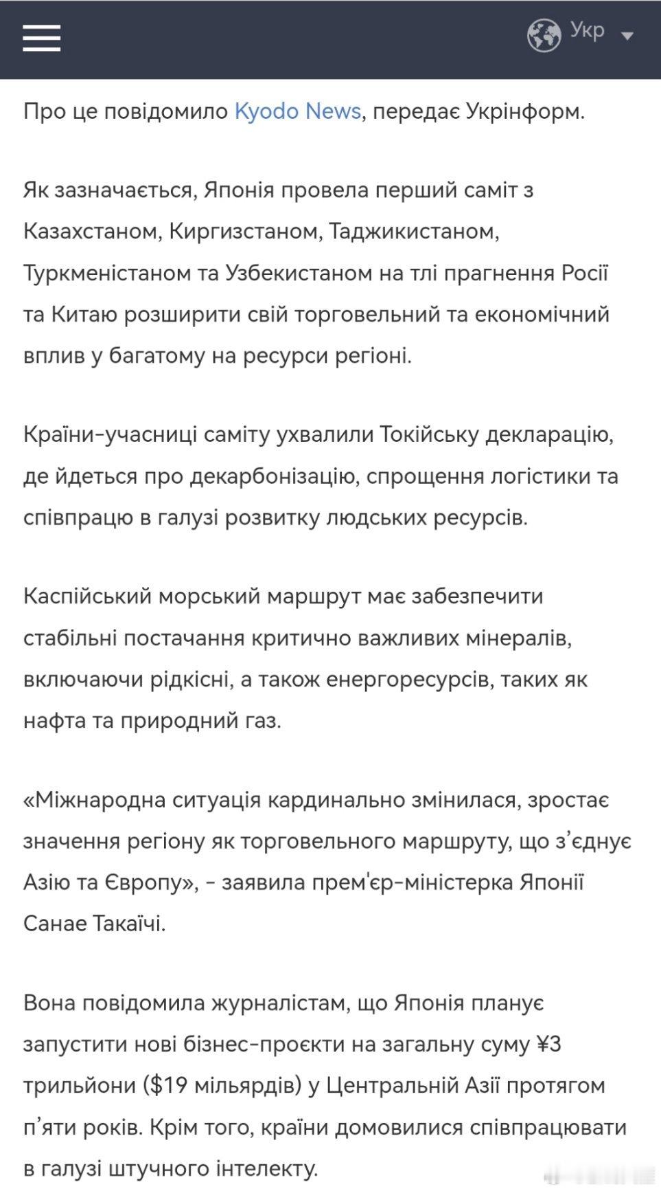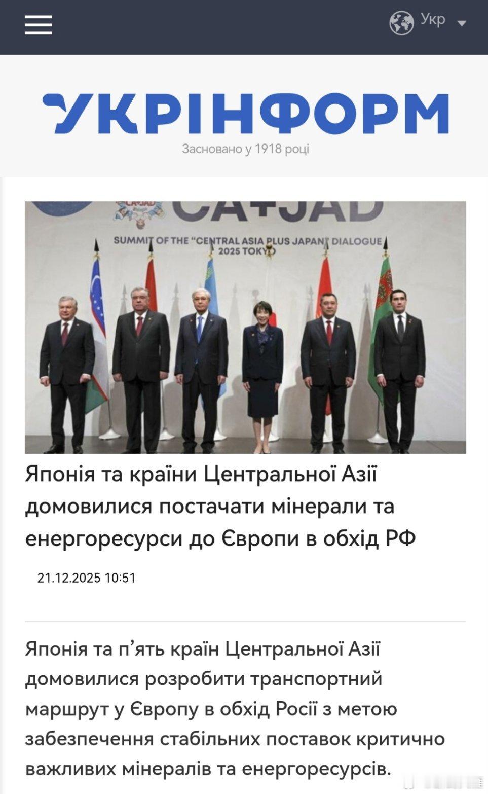 日本与中亚国家达成协议,将绕过俄罗斯向欧洲供应矿物和能源资源。日本与中亚五国达成协议,将开发一条绕开俄罗斯通往欧洲的运输路线,旨在确保关键矿产和能源资源的稳定供应。共同社报道了这一消息,乌克兰新闻社进行了转述。据报道,日本与哈萨克斯坦、吉尔吉斯斯坦、塔吉克斯坦、土库曼斯坦和乌兹别克斯坦举行了首次峰会。峰会成员国通过了《东京宣言》,内容涉及脱碳、物流简化以及人力资源发展领域的合作。里海航线将确保稳定供应关键矿产资源,包括稀土矿物以及石油和天然气等能源。她向记者透露,日本计划在未来五年内向中亚地区投入总额达3万亿日元(约合190亿美元)的新商业项目。此外,双方还就人工智能领域的合作达成了一致。(乌克兰在线新闻网)