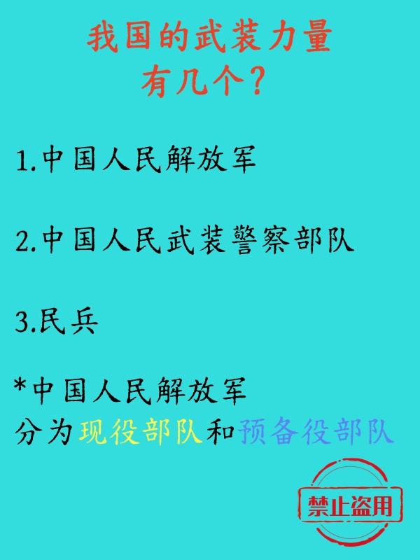 问:我国的武装力量有几个? 答:3个 我国的武装力量由3部分组成,分别是解放军、武警以及民兵。 解放军:又分为两部分,现役部队和预备役部队。是武装力量的主体力量,是对外防御和作战的主力。 武警:更侧重于国家内部的安全保卫工作,战时可需要协助解放军作战。 民兵:不脱离生产的群众武装组织,是国防体系中最广泛的群众基础。