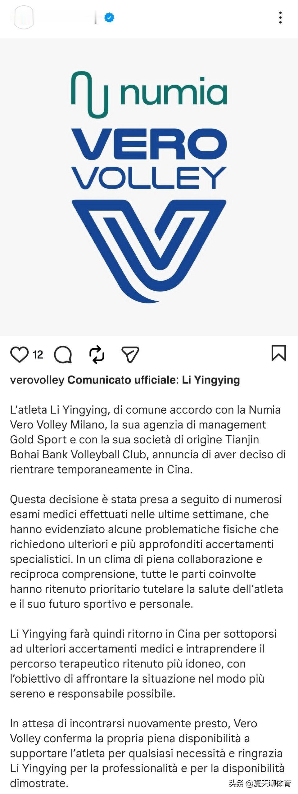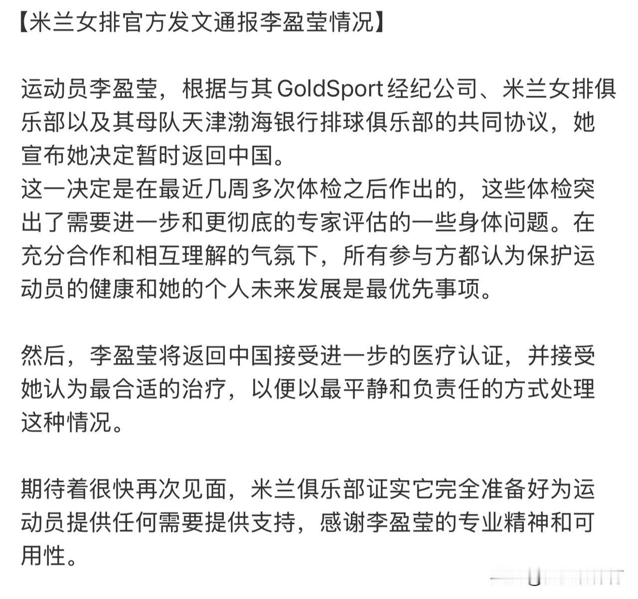 米兰俱乐部真的很有人情味啊,人家对李盈莹可是真好!刚刚发表官方声明,说等妹妹李盈莹康复完之后,还要找李盈莹签约[流泪]人家国外俱乐部真的很有人情味啊,做了好几次体检才确定让李盈莹好好康复,为了运动员的职业生涯考虑[赞][赞][赞]身体健康是第一位的,真的希望天津女排这个赛季能放过李盈莹,让她这个赛季好好养伤、好好康复,也期待李盈莹能早日跟意大利米兰俱乐部早日重逢!