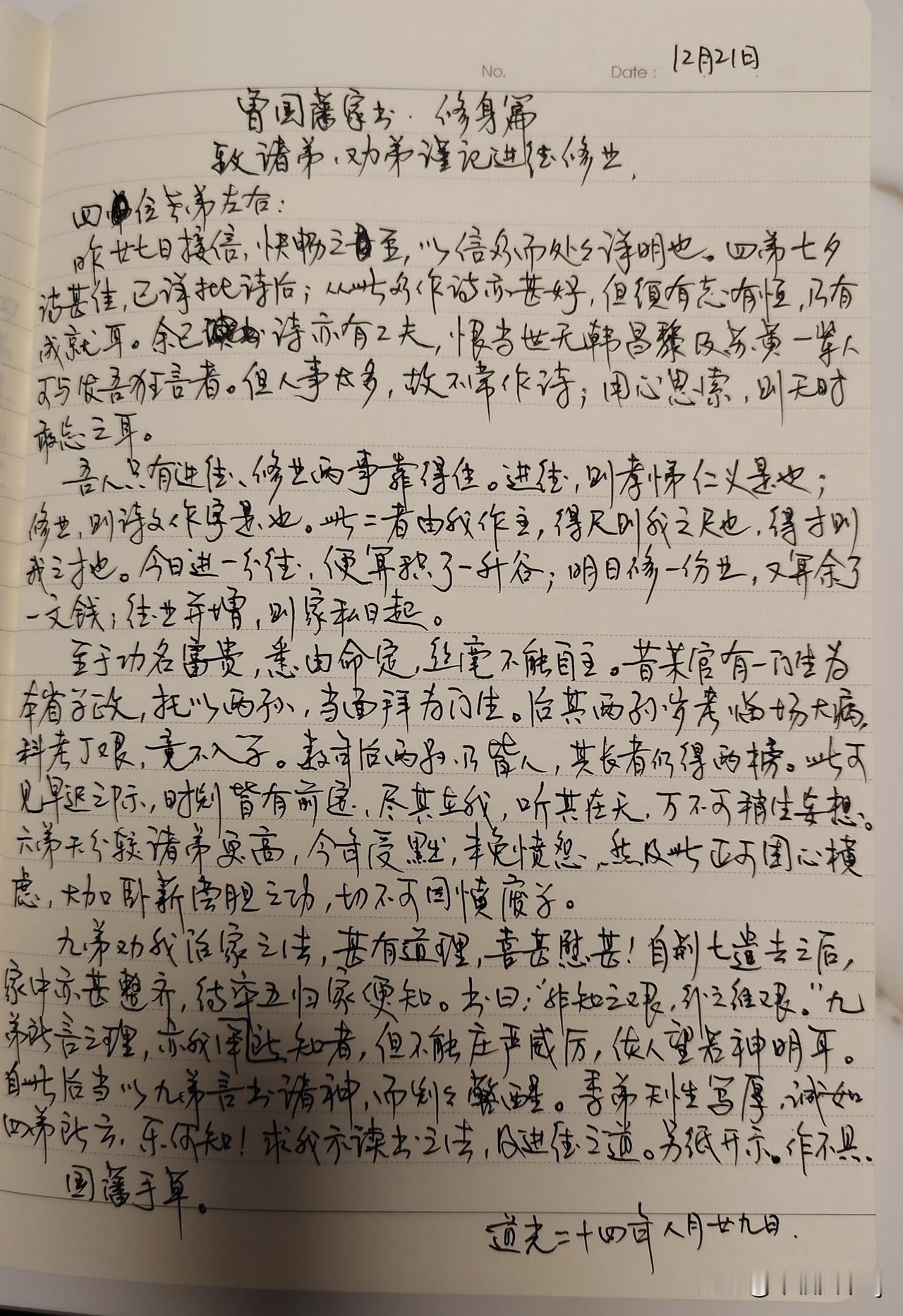 家庭共读并抄书第八天:《曾国藩家书》修身篇 致诸弟.劝弟谨记进德修业 体会:进德,孝悌仁义也;修业,诗文作字也。其实就是现在我们说得“德才兼备”,“德”是做人的根本,“才”是我们吃饭的本钱。正如曾国藩所说:“德业并增,则家私日起。”