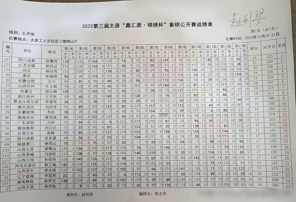 2025锦绣杯13轮,赵攀伟夺冠,郭凤达亚军,杨世哲第三,陈柳刚第四,万川第五! 这次锦绣杯整整13轮打下来,前几名的排名争夺比想象中还要焦灼,不到最后一刻根本看不出谁能笑到最后。 赵攀伟这次夺冠真的惊心动魄,他和郭凤达同积21分,最后全靠223对220这仅仅3个小分的微弱优势才险胜。 这种分差在如此高强度的比赛里几乎可以忽略不计,足以想象两人在盘面上咬得有多紧。 但我发现一个特别有意思的细节,排名三、四位的杨世哲和陈柳刚,小分竟然高达226。 这个数据甚至高过了冠亚军,感觉他俩这一路上碰到的对手实力可能更硬,只是在总分节奏上稍微差了那么一点。 郭凤达这次确实挺可惜的,距离登顶也就一步之遥,竞技体育的残酷往往就在这几分之间。 说实话,这种顶尖博弈到最后拼的已经不是技术了,更多是看谁能在那口气儿上顶住。 最后也要恭喜万川稳住了第五名,能在这个强手如林的名单里占住位次,实力都没得说。 期待下次这些大佬们再碰头,估计到时候排名又要来场大洗牌!