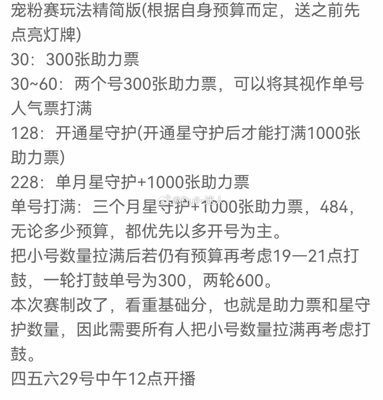 好的,新的一顿比赛开始了宠粉赛我们必须拿下开会员➕星守护➕1000张人气助力票(连续三天) 我直接➕v 拉粉丝群全部打满➕火箭➕12级灯牌来参加线下生日会 (能来参加的哥哥都来,年度最后一个比赛了,不要再错过了好吗)