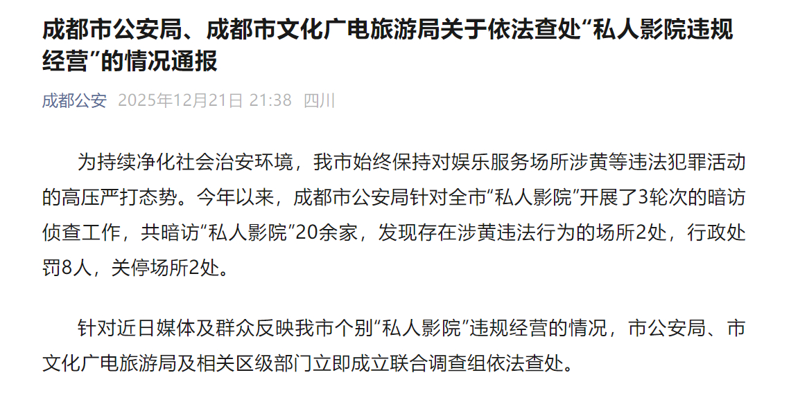 #成都通报私人影院提供陪侍服务#【成都公安:依法查处“私人影院违规经营”】据微信公众号“成都公安”12月21日消息,成都市公安局、成都市文化广电旅游局关于依法查处“私人影院违规经营”的情况通报。为持续净化社会治安环境,我市始终保持对娱乐服务场所涉黄等违法犯罪活动的高压严打态势。今年以来,成都市公安局针对全市“私人影院”开展了3轮次的暗访侦查工作,共暗访“私人影院”20余家,发现存在涉黄违法行为的场所2处,行政处罚8人,关停场所2处。针对近日媒体及群众反映我市个别“私人影院”违规经营的情况,市公安局、市文化广电旅游局及相关区级部门立即成立联合调查组依法查处。现已查明:锦江区两家“私人影院”存在未按规定对留宿客人实名登记的行为,已被依法责令整改;武侯区某“私人影院”存在提供以营利为目的的陪侍服务的行为,已被依法予以取缔。上述场所经营者及从业人员是否还涉嫌其他违法犯罪,正在进一步调查中。下一步,我们将持续强化协同联动,以“零容忍”态度,依法从严查处娱乐场所各类违法违规行为,深化源头治理与常态监管,持续净化文化市场。特此提醒行业各经营单位及从业人员,必须严格遵守国家法律法规,坚守经营底线,合法合规经营,共同维护良好的行业秩序和社会风气。近日,江苏广电总台荔枝新闻中心推出《神秘访客》系列,深入西安、成都、三亚、大理等地私人影院,发现这些影院悄悄变了味,“只想单纯看场电影”竟被下逐客令,取而代之的是,明目张胆提供各种“擦边”有偿陪侍。据媒体报道,一些私人影院以观影为诱饵,实则强制推销陪侍、包含露骨服务的套餐,甚至在被查处后通过换房等方式继续经营。价格越高,内容越露骨,甚至“有需要可带走过夜”,私人影院这种“挂羊头卖狗肉”的模式,把提供个性化观影体验的休闲场所,变成了违法交易的温床,不仅逾越了法律红线,更暴露出对新兴业态监管的漏洞。