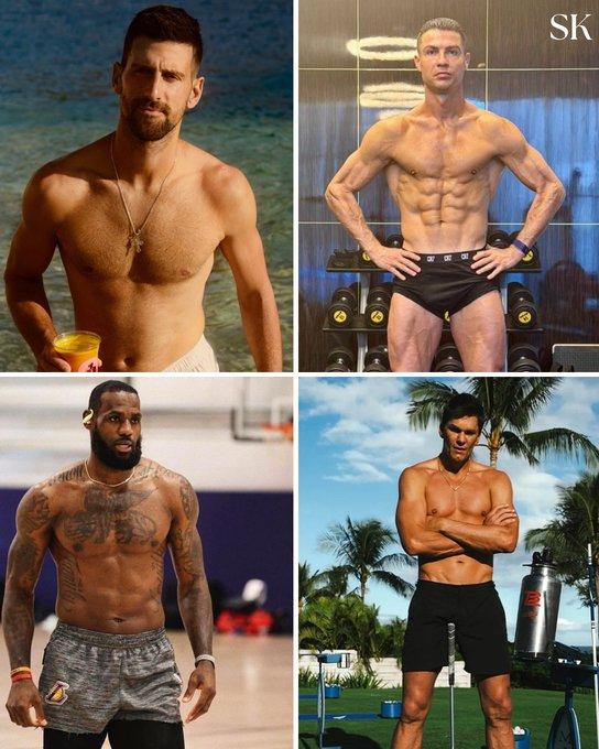 四个老男孩,身材咋都怎么好 德约科维奇,网球,38岁,1987 C罗纳尔多,足球,40岁,1985 勒布朗詹姆斯,篮球,41,1984 汤姆步莱迪,美式橄榄球,48岁,1977