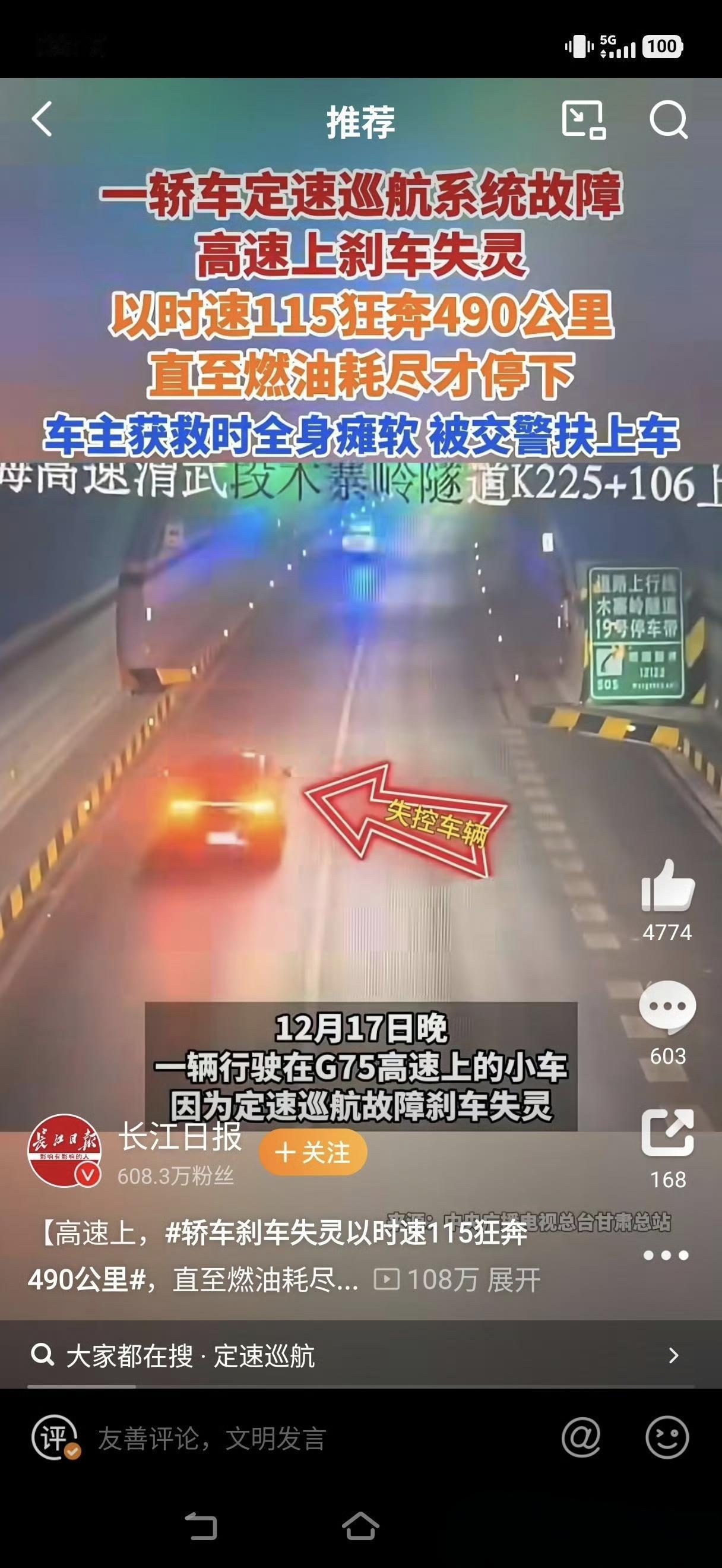 轿车刹车失灵以时速115狂奔490公里 这大概率又是司机的自导自演,或者压根不知道,他的车其实没有“失灵”。 这辆车只有定速巡航,大概率是油车,而定速巡航只控制汽车的车速,方向盘是不控制的。 他可以通过巡航面板的按钮关闭定速巡航。 他也可以轻踩刹车,退出巡航。汽车的刹车踏板是机械开关,几乎没有可能会“失灵”,基本的刹车信号是有的。 他甚至可以拉手刹退出巡航,或者直接通过档位操作退出巡航…… 退出巡航让汽车重新被控制的方法有很多,他都没有尝试,汽车巡航面板失灵+刹车失灵同时发生的概率太低了,谁信啊?【来自懂车帝车友圈】