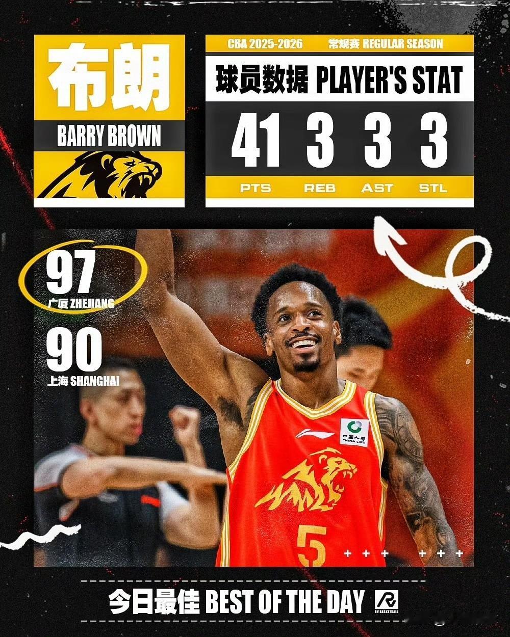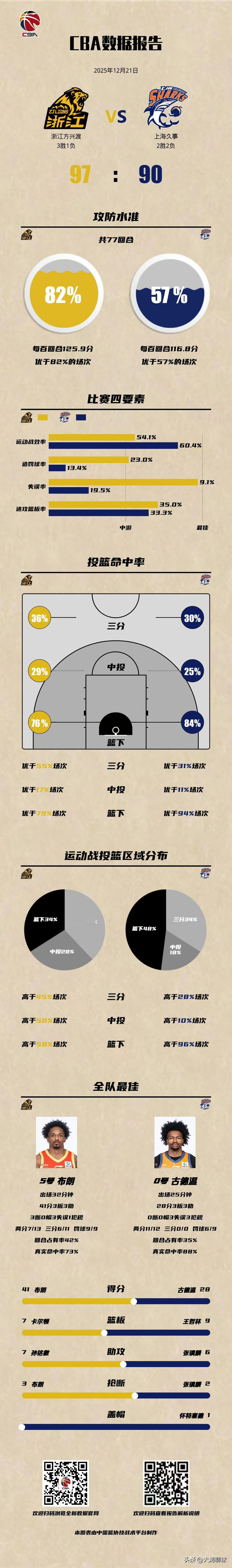 卫冕冠军太强了!恭喜浙江主场以97-90战胜上海队,本场浙江小布朗生日夜高效砍下41分,正负值+14,胡金秋拿下18分。 上海队发挥最稳定的依旧是古德温,全场拿下28分,张镇麟表现一般拿下11分,洛夫顿仅得10分!