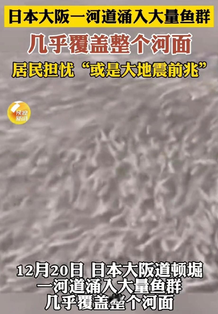 日本大阪河道现大量鱼群居民担忧地震 。12月20日,日本大阪道顿堀河道涌入大量鱼群,那画面,鱼几乎覆盖了整个河面。早在18日,就有大量鱼群在河中密集游动,路过市民纷纷拿出手机拍照。视频曝光后引发关注,不少日本网民担忧这是大地震的前兆。不过大阪府环境、农林水产综合研究所研究员分析,从视频看这些鱼可能是鲻鱼,水温高于周边地区或许是鱼群聚集的原因。虽说不一定和地震有关,但居民有这样的担忧也正常,毕竟在日本地震是常有的事儿,谁不怕来个大地震呢。