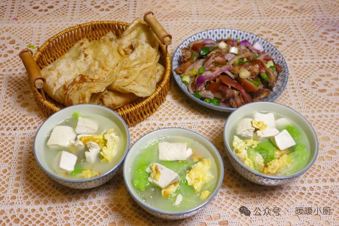 家常豆腐汤,配上葱油饼和凉拌菜,简单美味!🍜🥗🍲家常便饭,暖意融融,真美味儿。家常菜炖豆腐 豆腐鸡蛋白菜汤