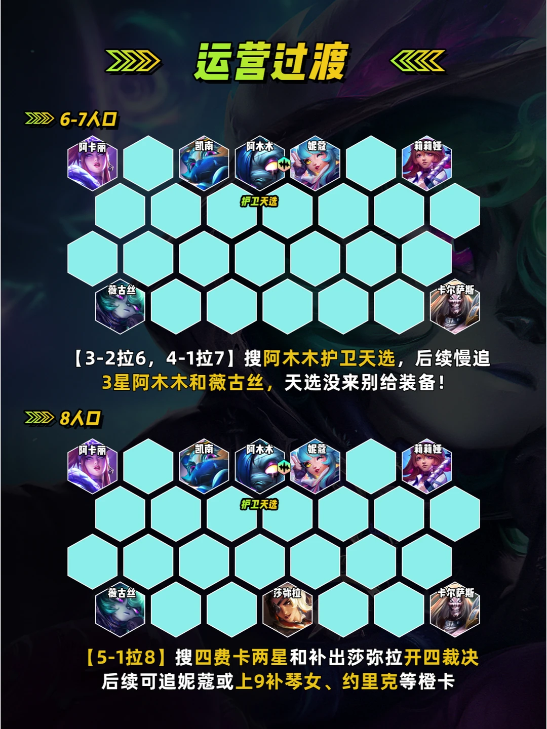兄弟们不想内卷的可以试试看这套阵容! 冷门好用七级轻松追出薇古丝+阿木木 后期可C阿卡丽和死歌灵活变阵,把把吃分!