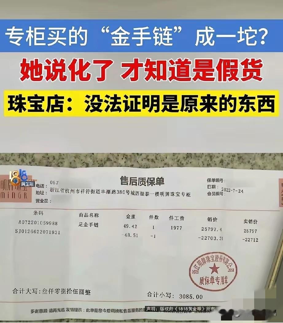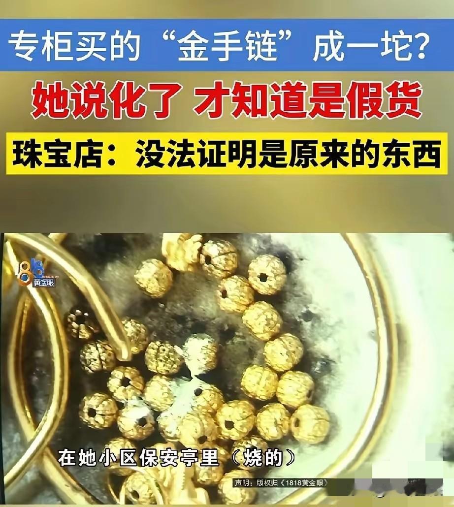 浙江杭州,女子将自己的金首饰,按930一克的价格置换。谁知,回收过程中用火一烧,一串40多克的手链竟化了,粘成了一坨。这明显是假货,女子找到专柜讨要说法。谁知,专柜刚开始说时间久远,找不到销售单,又说她在外面的小店烧过,不能证明是原来的东西,没法处理。女子瞬间气炸,好几万的东西几句话就想甩锅,太过分了。 金价一路走高的行情里,杭州的丁女士本想趁着好价钱,把三年前在银泰专柜入手的金手链拿去置换,没成想一场常规的验金,直接戳破了“品牌正品”的假象,更让她气炸的是,几万块的东西出了问题,专柜的回应全是甩锅套路。 丁女士的这条金手链来得并不容易,2022年夏天,她拿着自己的旧金饰到银泰某品牌专柜以旧换新,补了3000块钱加工费,其中光手工费就占了1977元,最终拿到了这条标注49.42克的足金手链,当时店员还当着她的面烧验了旧金,让她对专柜品质深信不疑。 今年12月,看着黄金回收价涨到930元一克,她收拾好包括这条手链在内的几件金饰,找到小区里的回收商准备置换,满心期待能换回一笔不小的收入。 回收商拿出专业喷枪开始验金,其他几件首饰经火烧后依旧色泽光亮,唯独这条沉甸甸的手链出了意外。 喷枪外焰刚接触到手链上的小圆珠,原本金灿灿的饰品就像蜡烛一样软化变形,很快粘成一团黑乎乎的残渣,完全没有纯金“真金不怕火炼”的特质。 回收商当场断定这不是真金,这样的结果让丁女士瞬间懵了,几万块买的品牌金饰,怎么会是一烧就化的假货? 带着这坨烧毁的“证据”,丁女士第一时间赶到当初购买的专柜,可眼前的景象让她心里一沉。原来的品牌直营店已经变成了加盟店,当初的店员早已离职,新工作人员查询系统后,直言找不到她的销售记录。 丁女士掏出保存完好的质保单,上面清晰写着手链克重、加工费等信息,可对方依旧不为所动,只说系统里没有存档,无法核实。 不死心的丁女士联系到品牌总部,没想到得到的回应更让人心寒。总部先是附和专柜说法,称交易时间过去三年太久,无法追溯;接着话锋一转,把责任推到丁女士身上,说她擅自找外面小店烧验首饰,破坏了商品原始状态,现在没法证明这坨残渣就是当初卖出的那条手链,因此拒绝承担任何责任。 更让丁女士无法接受的是,当初付款时,店员让她把钱转到了私人账户,而非公司对公账户,如今这也成了品牌方质疑交易真实性的理由。 丁女士越想越委屈,质保单、付款截图都清清楚楚,回收商用的也是行业公认的火试法——纯金在1000℃左右的火焰下只会发亮不会变形,只有掺了大量杂质的假金才会一烧就化。 可品牌方却无视这些基本常识,用“时间久”“证据毁”“查不到记录”等理由连环甩锅,把消费者的维权路堵得严严实实。 这件事很快在网上引发热议,不少网友分享了类似的维权经历,有人吐槽品牌加盟店管理混乱,收款走私人账户、销售记录不存档是常见套路; 也有人质疑品牌方的双重标准,卖货时强调“专柜正品有保障”,出问题后却把责任推得一干二净。 随着黄金以旧换新需求激增,类似的消费纠纷也越来越多,定价模糊、验金不透明、售后甩锅等乱象,让不少消费者对品牌金饰失去信任。 值得注意的是,2025年底刚发布的《黄金以旧换新经营服务规范》,已经明确要求品牌方规范验金流程、留存交易记录、明示售后责任,可丁女士遇到的品牌显然没有落实这些要求。 法律层面上,加盟店使用统一品牌标识,消费者有理由相信其行为代表品牌方,即便店铺转让、人员变动,品牌也不能免除应尽的质保义务。 而“火试法”作为行业通用的鉴别手段,品牌方以“私自验金破坏证据”为由拒绝担责,显然站不住脚。 如今,丁女士已经准备向工商部门投诉,并咨询了律师,希望通过法律途径维权。 她手里的质保单、付款截图,以及回收商的验金经过,都成为关键证据。这场看似简单的假货纠纷,不仅关乎几万块的财产损失,更牵扯到品牌信誉和行业规范。 品牌专柜的金字招牌,靠的是品质和售后积累的信任,而不是遇到问题就推诿甩锅。 消费者选择专柜购物,图的就是一份放心,可当“正品保障”变成“维权无门”,受伤的不仅是单个消费者,更是整个黄金消费市场的公信力。 对此,你们有什么看法,欢迎评论留言~