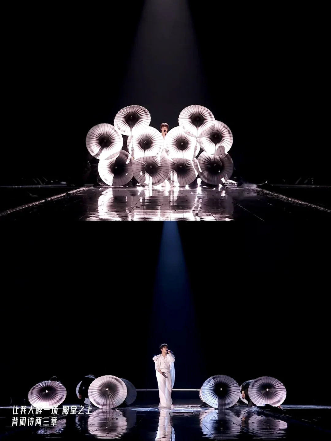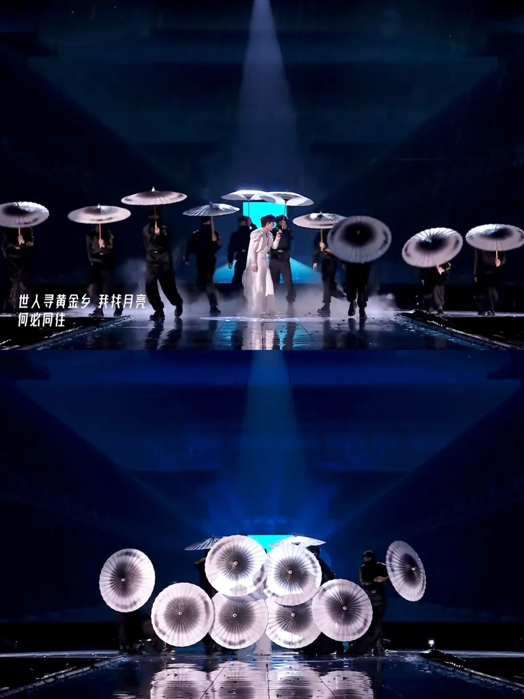 在周深的献唱中,LED后方大屏采用的动态视频为近景传统建筑,前方的伴舞拿着油纸伞与后方场景形成空间层次,在整个布景中,舞者手中的油纸伞既是点缀又是重点,在舞台上组合成多种排列方式,与周深的深情献唱,更加温和、美好。