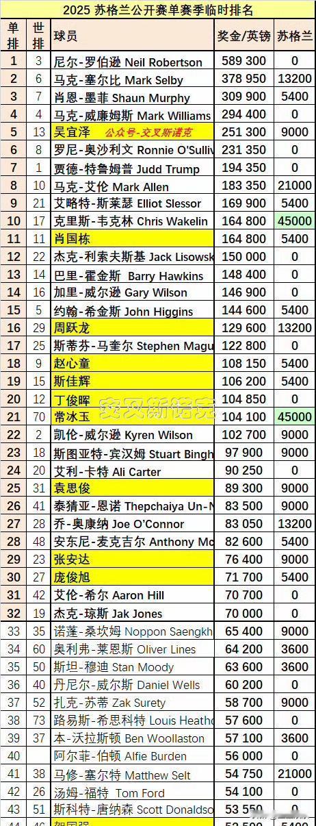 这不是常冰玉一个人的战斗。 他今晚握着的球杆,挑着四个中国球员的赛季命运。 他赢,直通冠中冠、世界大奖赛和球员锦标赛。 对手韦克林已上岸,但周跃龙的席位立刻被挤掉。 最新排名揭晓残酷逻辑:常冰玉夺冠将从第60跃升第32。丁俊晖,即使状态回暖,仍卡在第35名的门外。 而周跃龙,正拼命追赶那微弱的积分优势。 他悬在线上,看着队友的手。 常冰玉扣动扳机,子弹可能穿过他的赛季。 斯诺克的江湖,一个人的胜利,是一代人的机会。 龙门之下,是江湖。