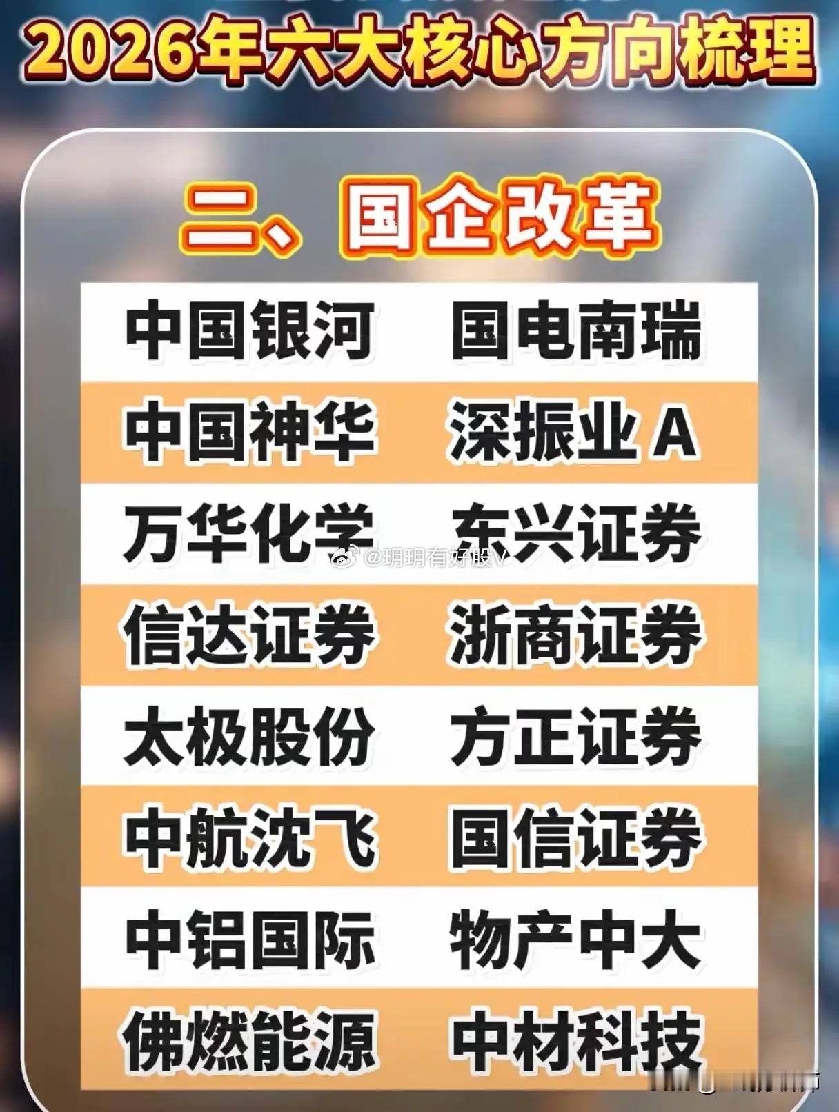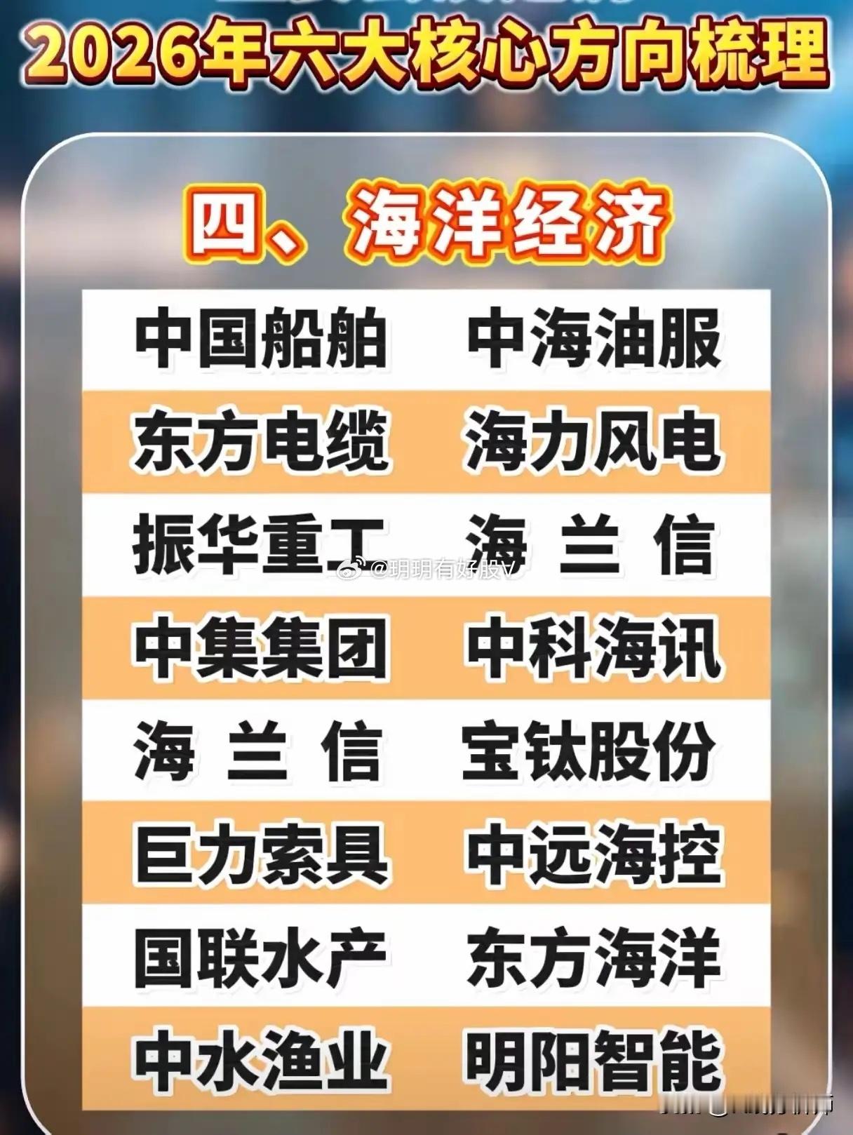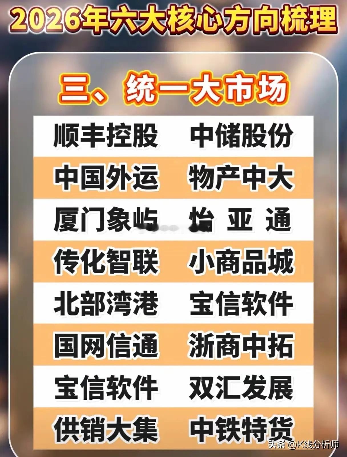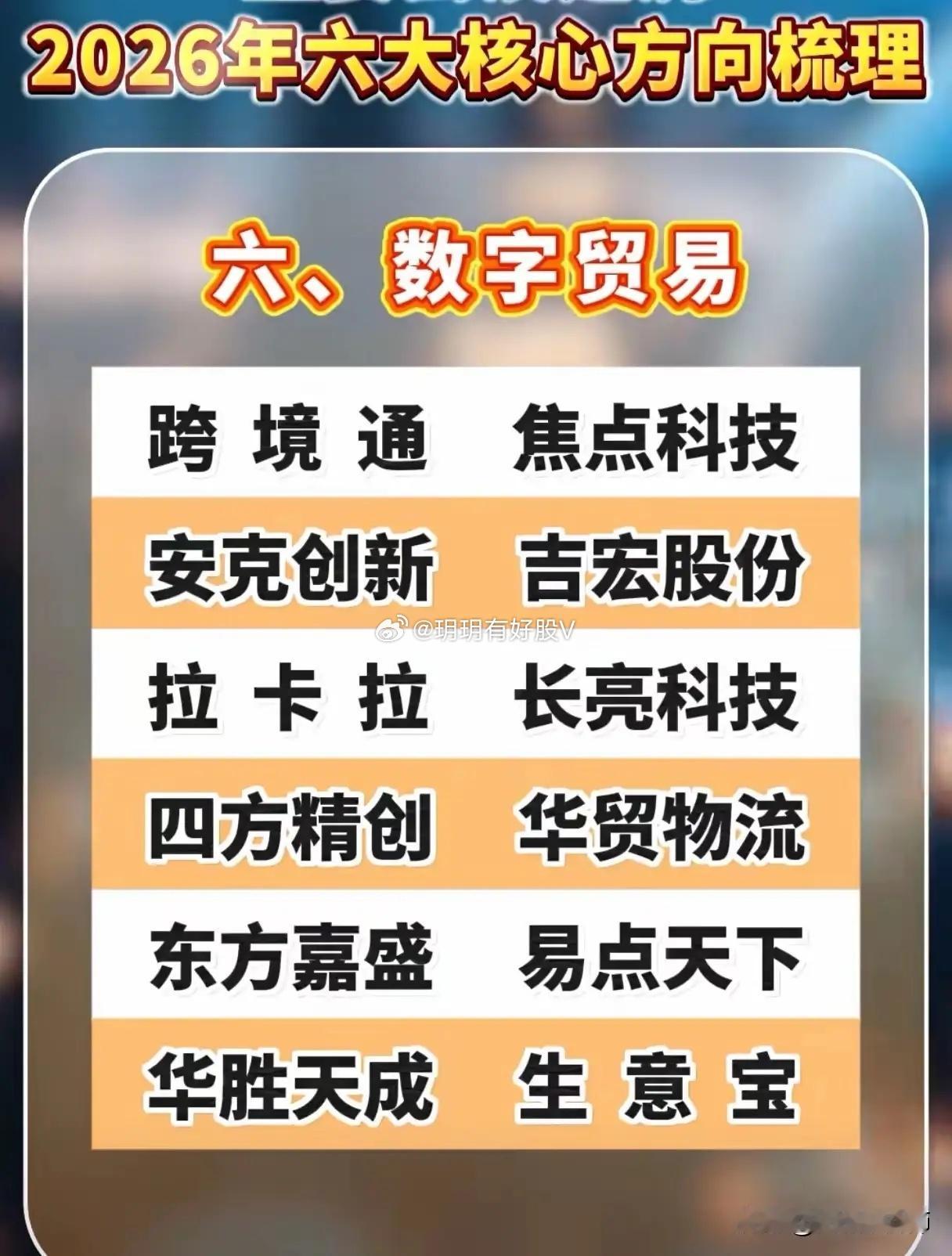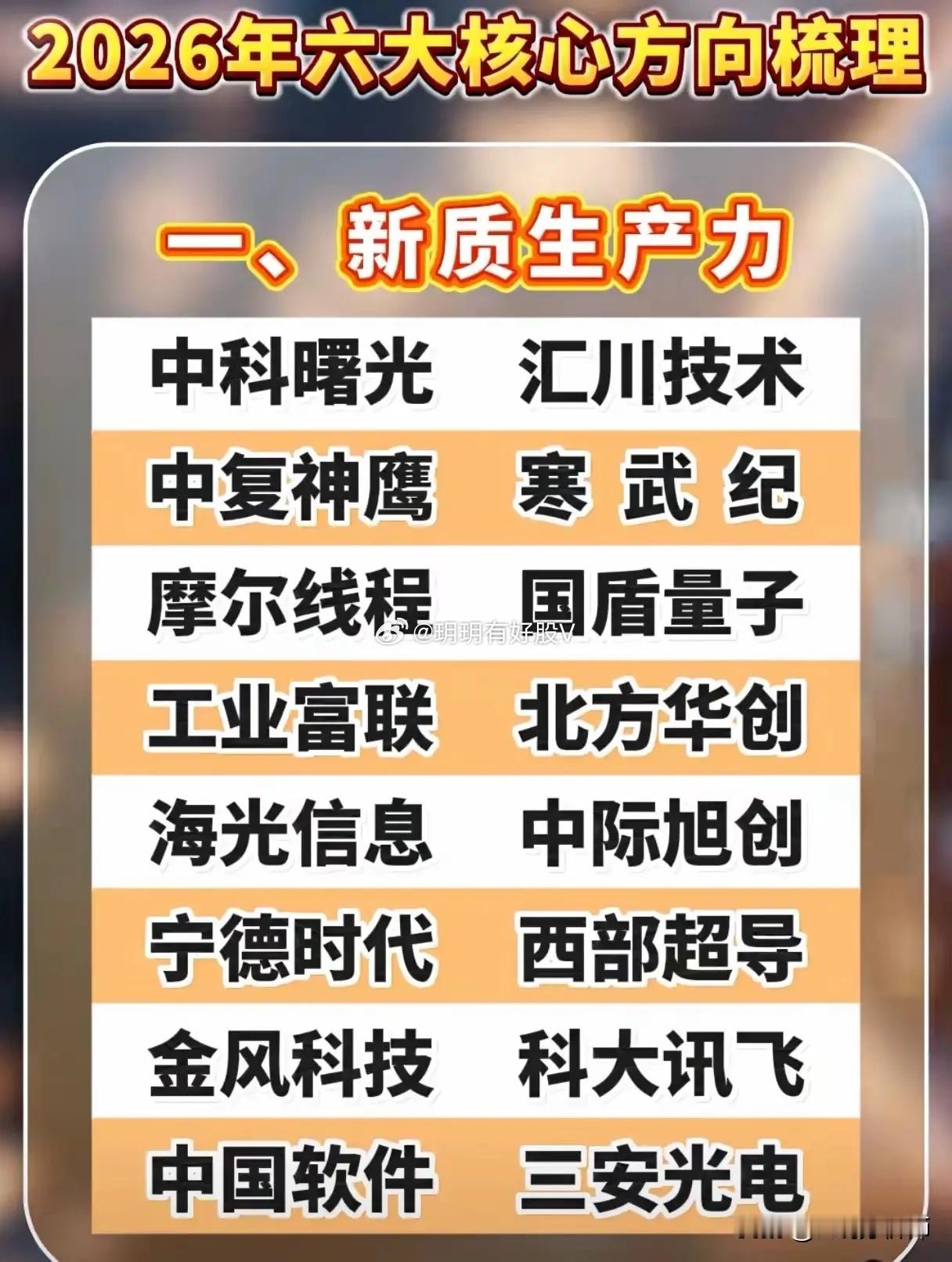 2026年六大核心方向。以摩尔线程、海光信息、北方华创、科大讯飞、三安光电为代表的新质生产力方向。以中航沈飞、中铝国际、中材科技、中国银河、国电南瑞、东兴证券为代表的国企改革方向。以宝信软件、物产中大、厦门象屿、小商品城为代表的统一大市场领域。以中国船舶、东方电缆、海兰信、宝钛股份、东方海洋、中海油服、巨力索具为代表的海洋经济方向。以保利发展、招商蛇口、张江高科为代表的房地产方向。以跨境通、安克创新、四方精创、生意宝、易点天下、焦点科技为代表的数字贸易领域。其中2025年前三季度净利润增幅最高的是寒武纪,利润增长幅度为3200%,中复神鹰利润增长超850%,中科曙光第三季度同比利润增长120%。中国船舶规模净利润同比增长115%。中际旭创第3季度净利润同比增长108%。