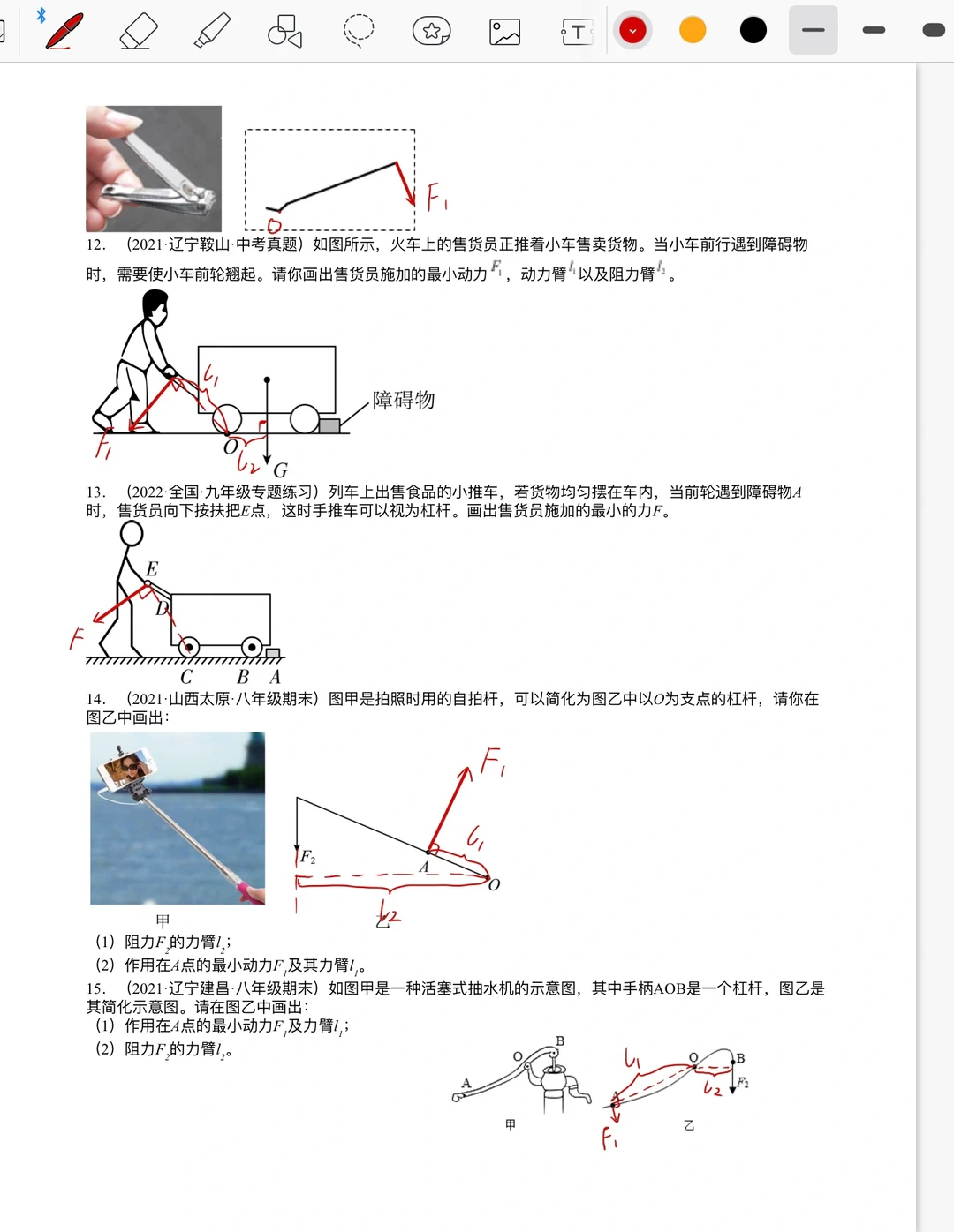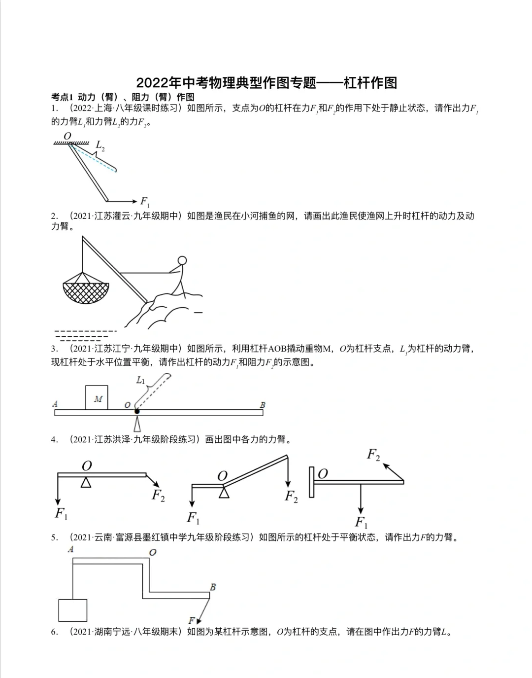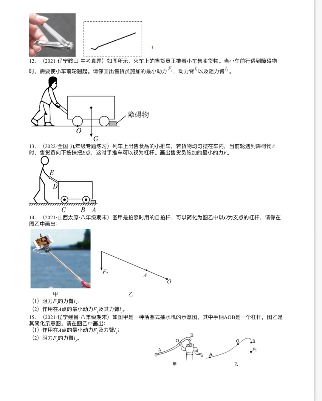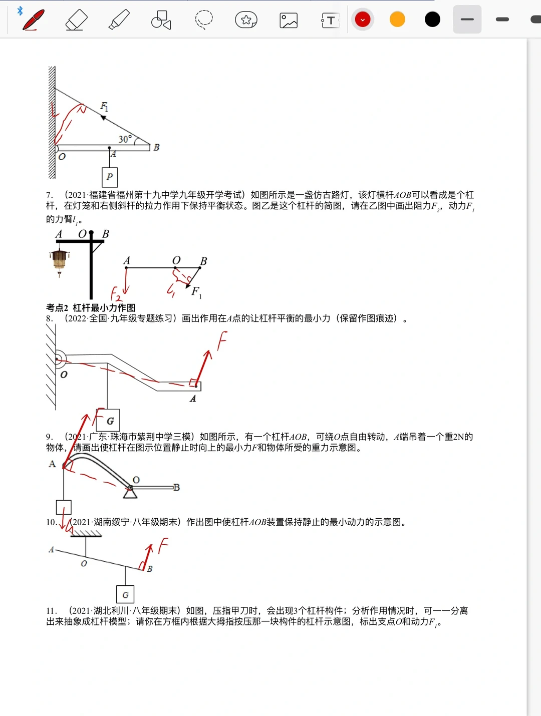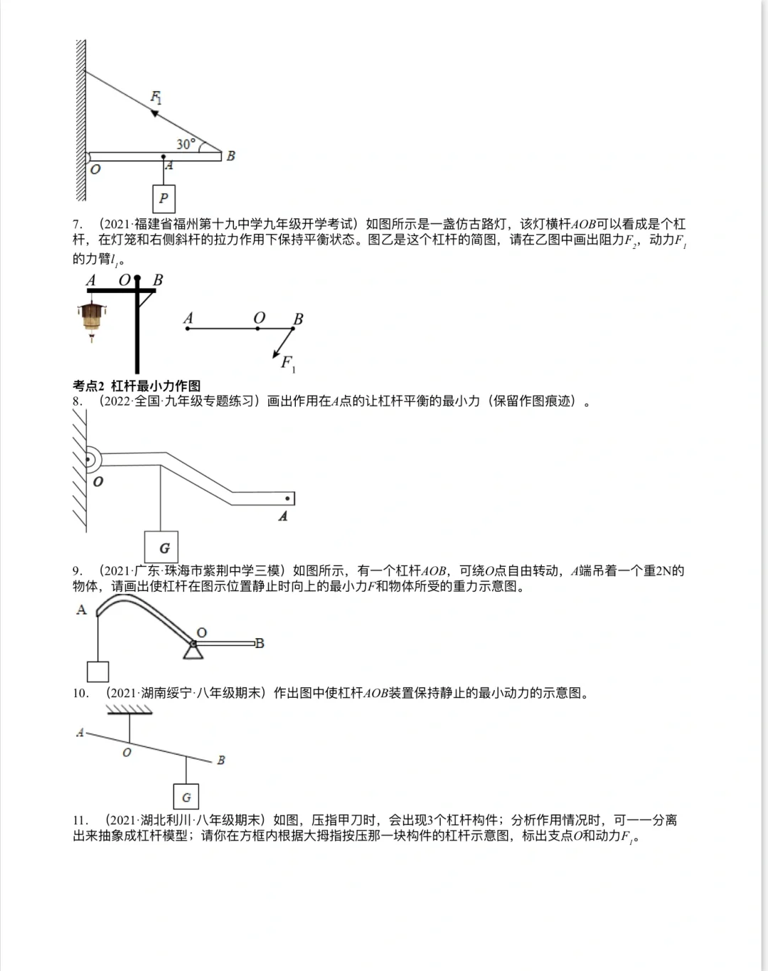 1.画力和力臂:仅需记住一点,力和力臂一定是互相垂直的。过支点向力的作用线(就是力所在直线)画垂线,即为力臂。已知力臂画力,那么直接做力臂的垂线,但是力一定要画在杠杆上。需要根据题干再确定力的方向,切勿搞反。 2.最小力的画法:牢记三个字“点点垂”,找到支点和距离支点最远的点(阻力和动力作用点是可以在支点同侧,也可以异侧),连接支点于该点,然后过该点作垂线,即为最小力(因为此时力臂最大)。最后需要根据题干确定力的方向。