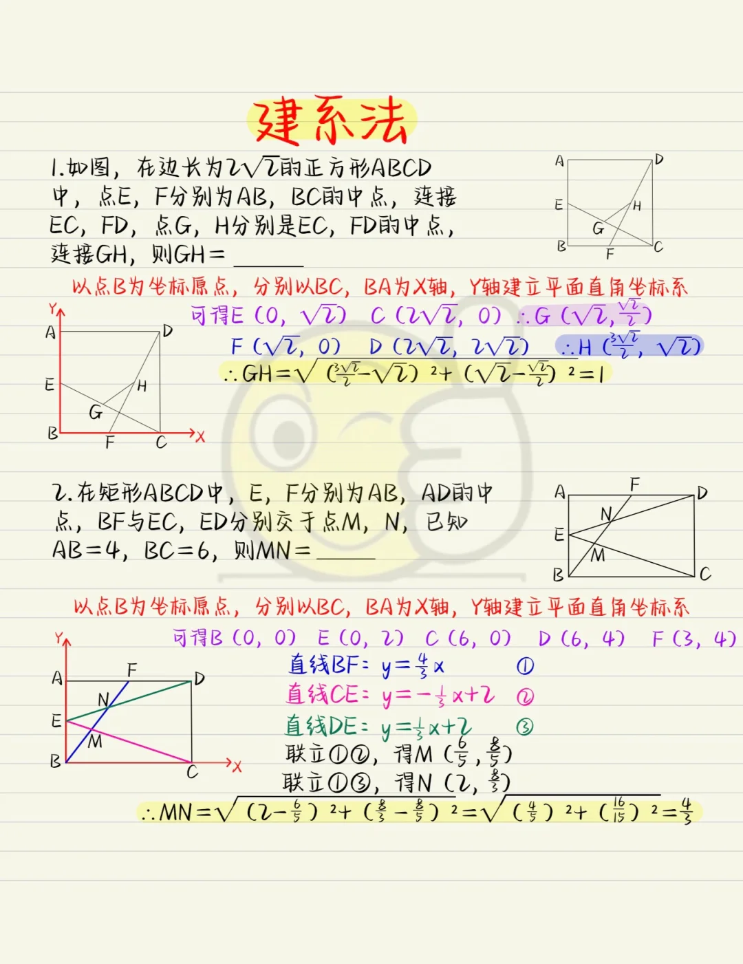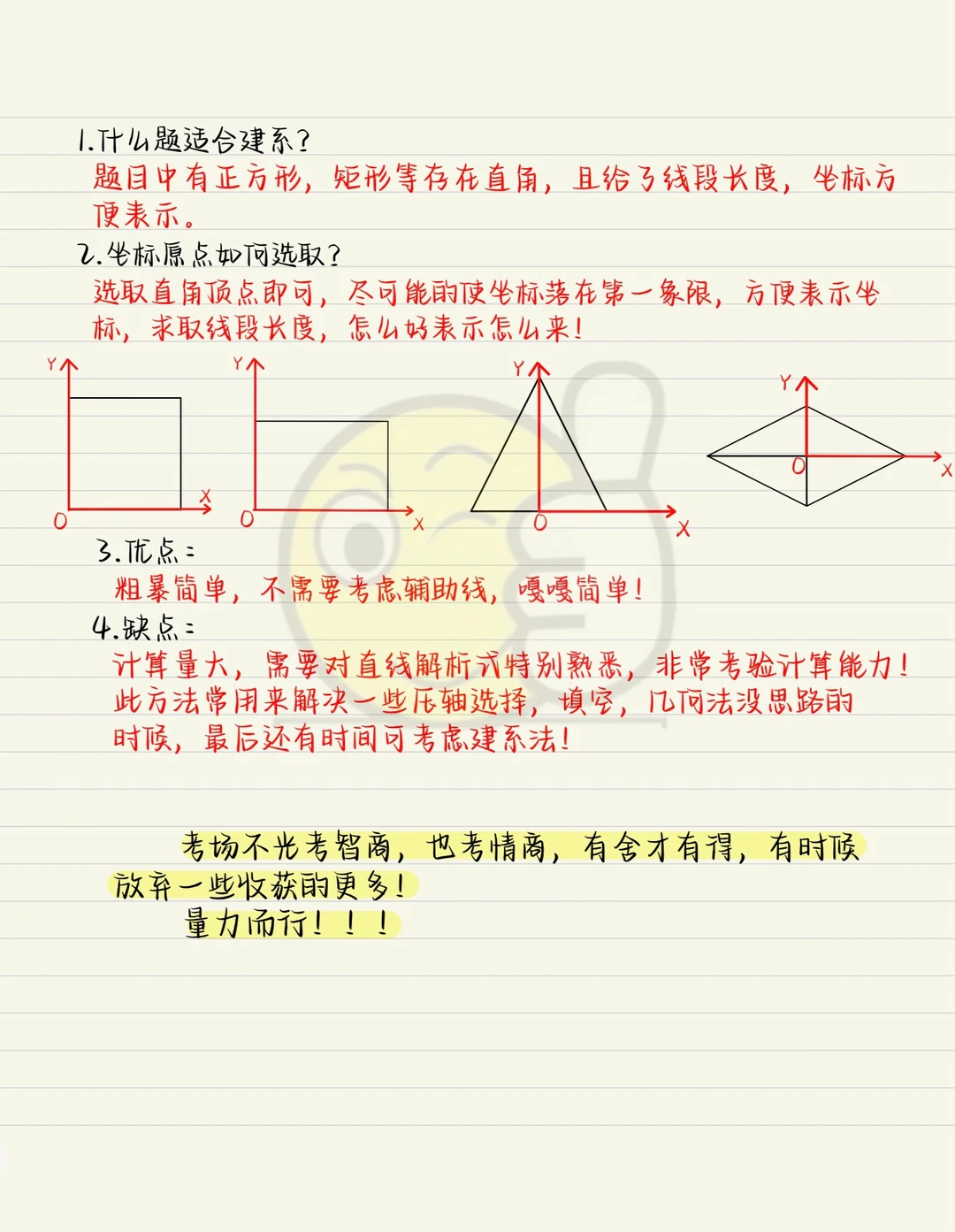 建系法:很多压轴几何难题不知道如何做辅助线,就可以用建系的方法,省略做辅助线的过程,就是算,简单粗暴,缺点就是计算量有点大。很有必要掌握一下。