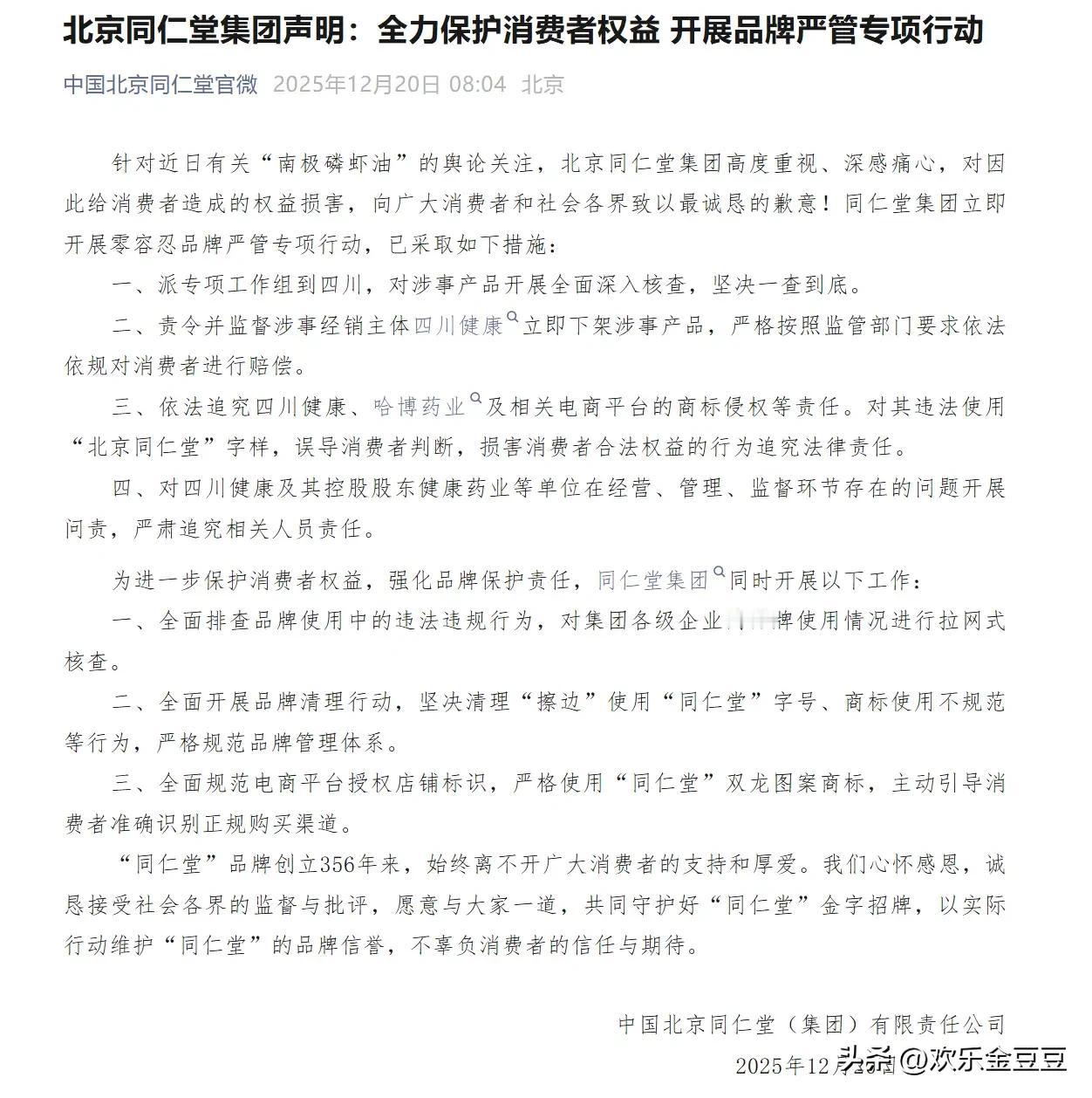 同仁堂300年口碑翻车!买药只要是“同仁堂”商标都优先考虑,就是冲着百年老字号!现在却爆出3.7元成本卖60元假货,贴牌乱象真是真坑。同仁堂这操作真让人大跌眼镜!号称含南极磷虾油的凝胶糖果,被查出根本没加一点磷虾油,成本才3.7元一瓶,转手就卖60多,翻了近20倍! 外包装上“北京同仁堂”五个大字格外醒目,还印着类似的双龙图案,普通人一看就以为是正宗老字号产品。结果查下来,这只是四川一家挂着“同仁堂”名头的公司经销的,用的是自有商标“朕皇”,与北京同仁堂核心商标无直接关联! 生产商自己都承认没加磷虾油,可经销商却喊着“毫不知情”。业内人都清楚,合格磷虾油原料成本都不低,3块多的出厂价根本不可能做出真产品,这明显是揣着明白装糊涂! 电商上还有不少“同仁堂”相关的健康产品,要么是其他公司经销,要么是贴牌生产,都靠着“同仁堂”的名气误导消费者,有的还敢宣传“7天改善亚健康”,纯属涉嫌违法炒作。 为什么300多年的老字号会成假冒、贴牌重灾区?关键还是“同仁堂”商标太分散,不少关联公司打着老字号旗号搞贴牌,母公司又没尽到监管义务。消费者冲着“同仁堂”的口碑买单,最后却被这些“擦边球”产品坑了,老字号的信誉也被一点点消耗。同仁堂磷虾油 现在涉事产品已经下架,监管部门也约谈了相关企业,但更该管的是贴牌乱象!希望能好好整治这种借老字号名头圈钱的行为,别让百年口碑毁在“贴牌”上!北京同仁堂也迅速致歉消费者,大家觉得它的道歉能不能消除此次影响?