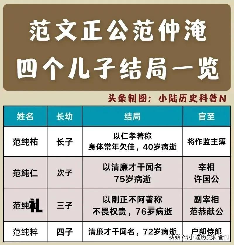 二儿子,是宰相, 三儿子,是副宰相, 这是谁家的儿子,这么优秀? 没错,就是先天下之忧而忧,后天下之乐而乐的范仲淹。 他自己不以物喜,不以己悲,而且还严格家规,通过自己的言传身教,让儿子们一个比一个优秀。 二儿子和三儿子就不说了,就算是成就不太高的四儿子,也曾经担任过户部侍郎等一些中等官职。 而少年聪慧的长子,反而成就最低。 这是因为长子在20岁左右就染病,直接卧榻到去世,影响了他的成就。