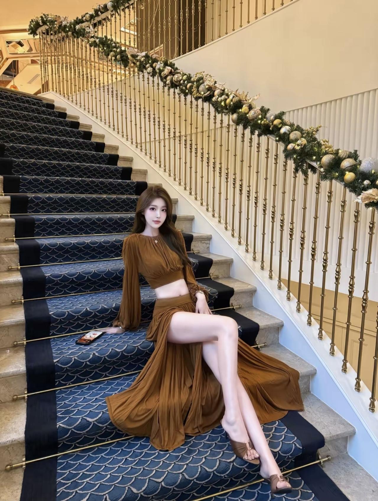 焦糖棕的浪漫,在鎏金阶梯的光影里酿成温柔的诗,裙摆轻垂的瞬间,仿佛把法式慵懒揉进