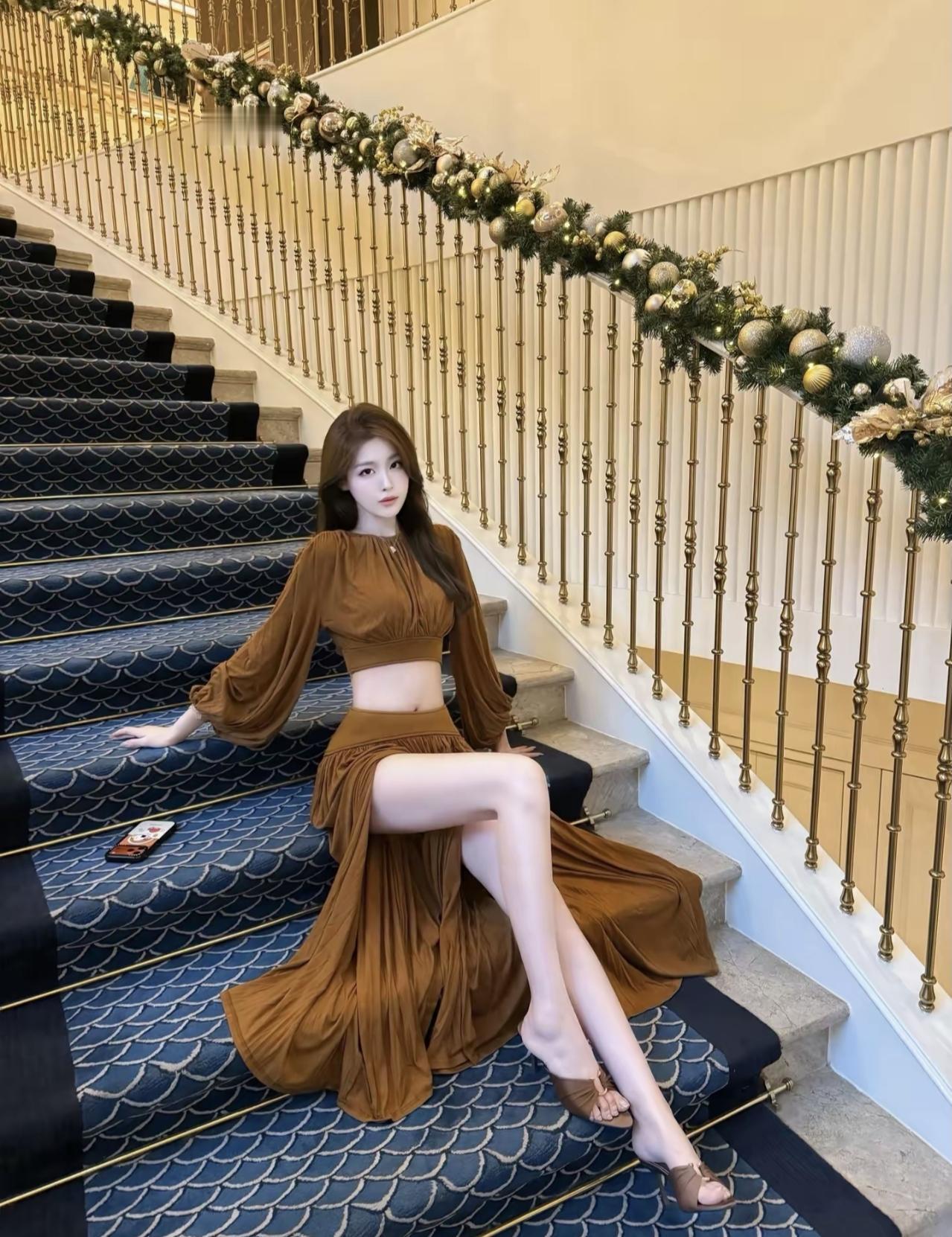 焦糖棕的浪漫,在鎏金阶梯的光影里酿成温柔的诗,裙摆轻垂的瞬间,仿佛把法式慵懒揉进了这一方精致角落