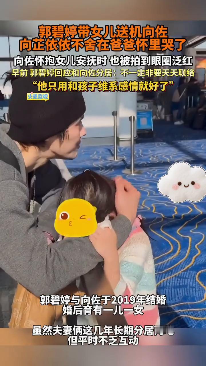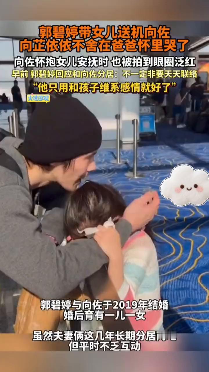 郭碧婷带女儿送机向佐,向芷依依不舍在爸爸怀里哭了。 早前郭碧婷回应和向佐分居:不一定非要天天联络,他只用和孩子维系感情就好了。 2025年12月21日,郭碧婷携女儿向芷为向佐送机,女儿因不舍父亲离开当场落泪,离别场面温馨感人。之后一家三口还隔着登机走廊的窗户相望,画面充满温情。 12月10日,郭碧婷在中国台湾出席活动时被当地媒体问到长期与老公向佐分居两地要如何维系婚姻,她大咧咧地表示向佐只需要和两个孩子维持感情就好了。 郭碧婷表示,她在婚前就和向佐"打过预防针",说自己喜欢在台北生活,婚后也不想变,而婆家人都非常支持她,"他们也没有逼我生小孩,是我自己想生,从来不会有任何意见。大家飞来飞去也很方便,过年、暑假都会长时间聚会。 郭碧婷半开玩笑说,现代人的观念早就变了,不必非要嫁鸡随鸡、嫁狗随狗。 郭碧婷与向佐于2019年结婚,婚后育有一儿一女,虽然夫妻俩这几年长期分居两地,但平时不乏互动。 喜欢就点个关注吧,再委屈你自己。