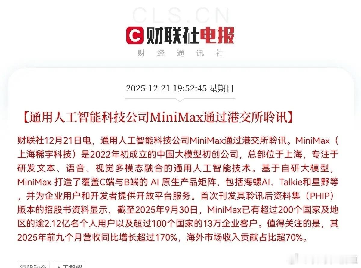 深夜又来利好了!恭喜满仓的股民们!明日AIGC概念又要火力全开了,预计要高开高走收大阳线了吧!晚间7点52分,财联社最新消息,通用人工智能科技公司MiniMax(上海稀宇科技)通过港交所聆迅,这是一家中国大模型初创公司,发展速度惊人,近三年的发展,公司业务已经遍布了超200个国家,个人客户数超2.12亿,企业客户已经超13万,海外收入非常强劲,占比已经超70%,这个消息对于AGI产业是重大利好,这标志着AI行业已经从技术探索期进入到了规模化商用期,未来具备多模态能力、垂直场景深耕能力及生态构建力的AI公司,更易获得市场认可,MiniMax若成功上市,未来甚至有可能对标OpenAI,这或许就是中国版的“OpenAI”,甚至有望冲击AGI全球第一股,中国在AGI领域的自主创新能力已经取得了重大突破,中国在全球人工智能中的竞争中又添一员猛将,这是最大的利好消息!股民们!坐稳扶好!受此利好消息影响,不出意外的话AIGC概念要起飞了!人工智能板块要起飞了