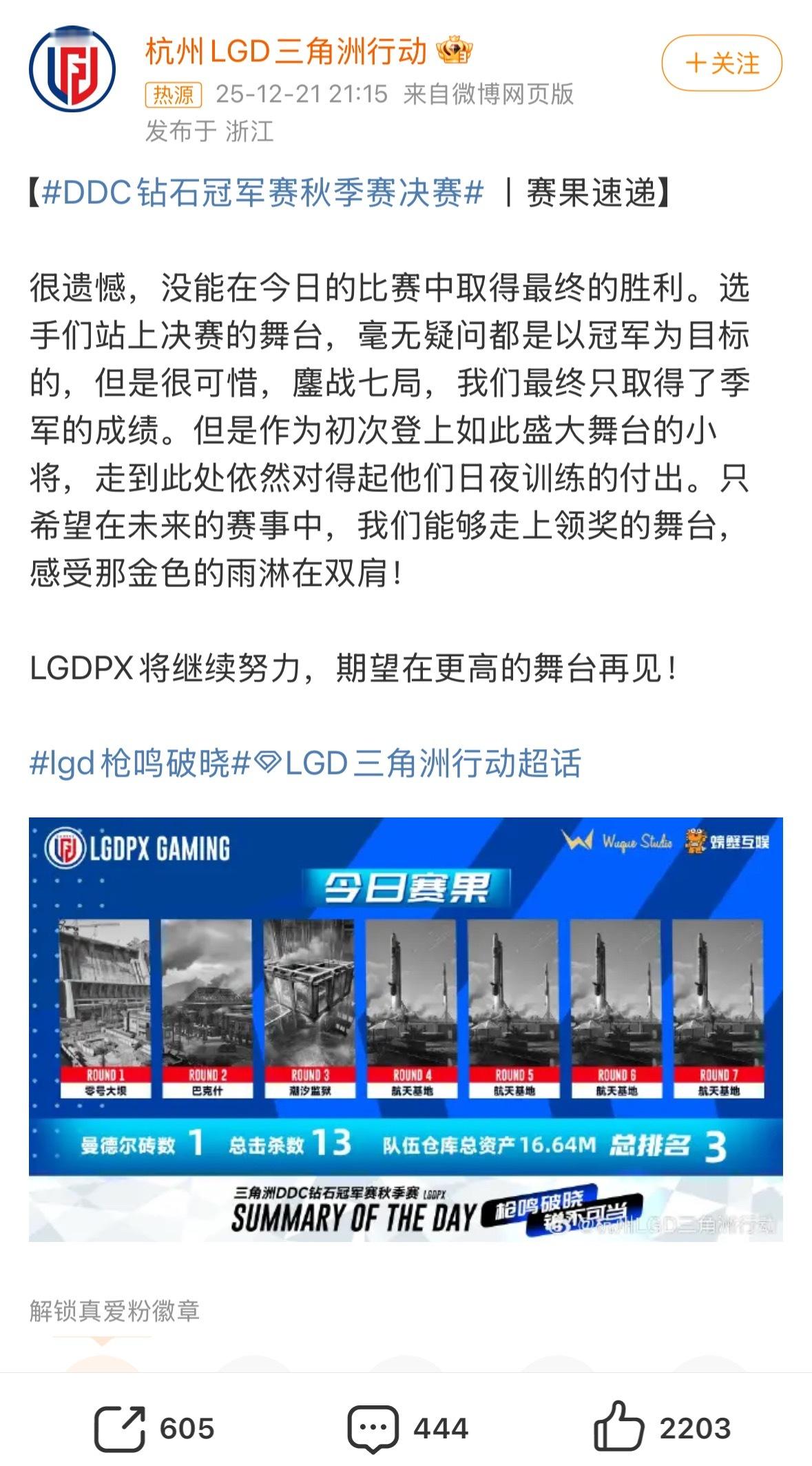 LGD发文期望在更高的舞台再见LGD 的表现超惊艳,期待在更大舞台见证你们的蜕变,相信下一次会更耀眼~JDG 全程高能输出,虽与冠军擦肩而过,但每一份努力都值得被铭记,未来可期!JDG发文遗憾与总冠军失之交臂