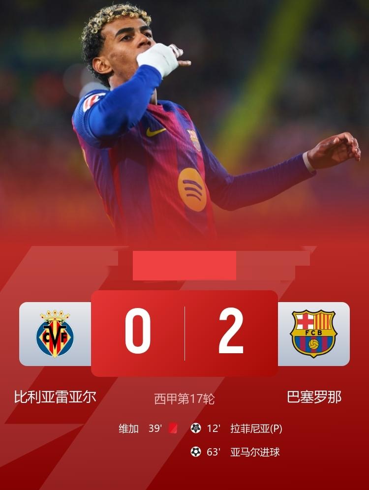西甲 巴萨2-0十人黄潜 亚马尔破门,拉菲点射建功 12月21日23点15分,西甲第17轮,比利亚雷亚尔主场迎战巴塞罗那。上半场,拉菲尼亚点球命中,维加染红。下半场,德容助攻亚马尔破门。最终,巴塞罗那2-0比利亚雷亚尔!积分榜上:巴塞罗那积46分以4分领跑,比利亚雷亚尔少赛两场积35分第四