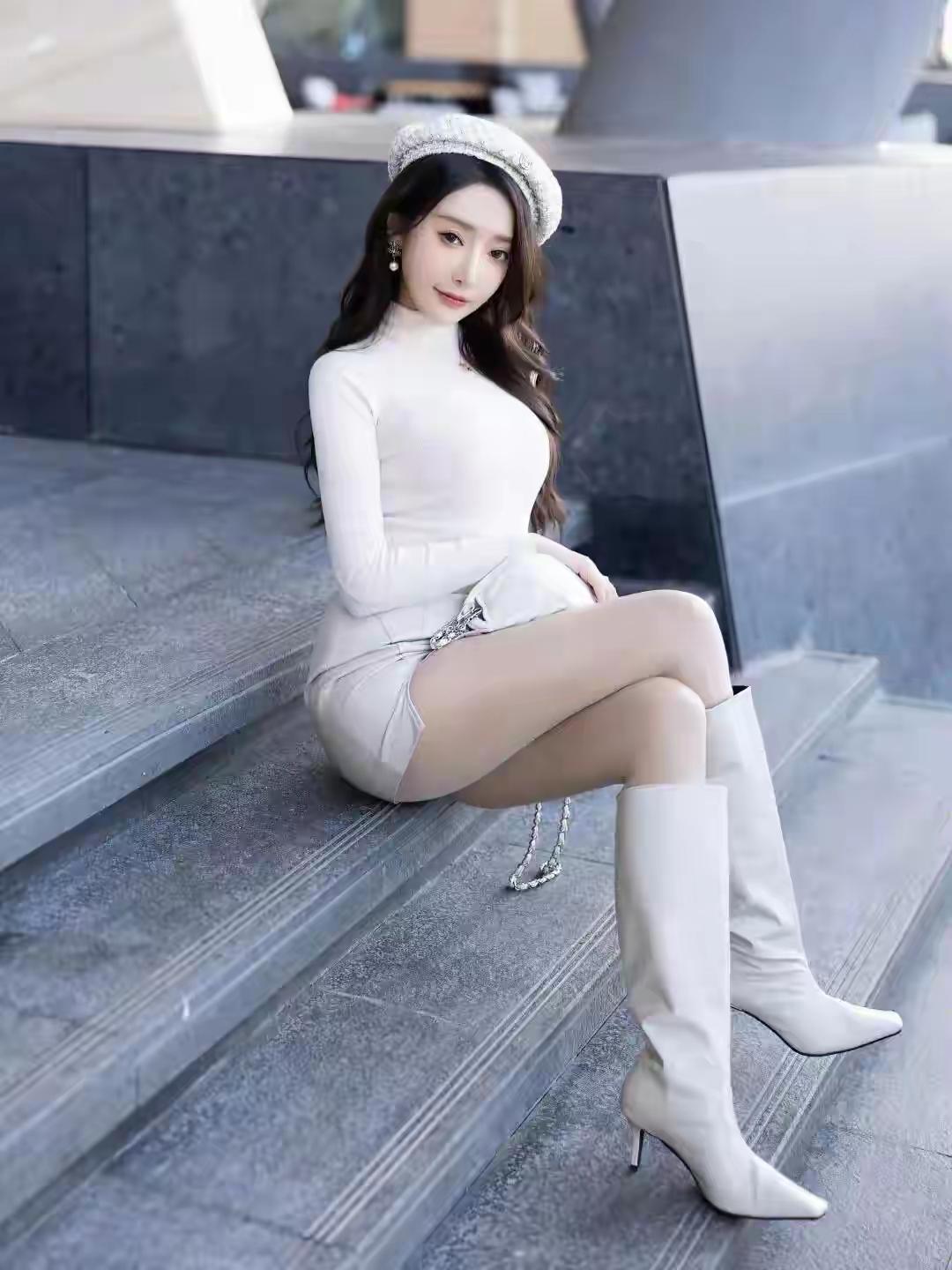 优雅白裙搭配高筒靴,都市女孩的时尚穿搭白色高跟鞋穿搭 白色长靴穿搭