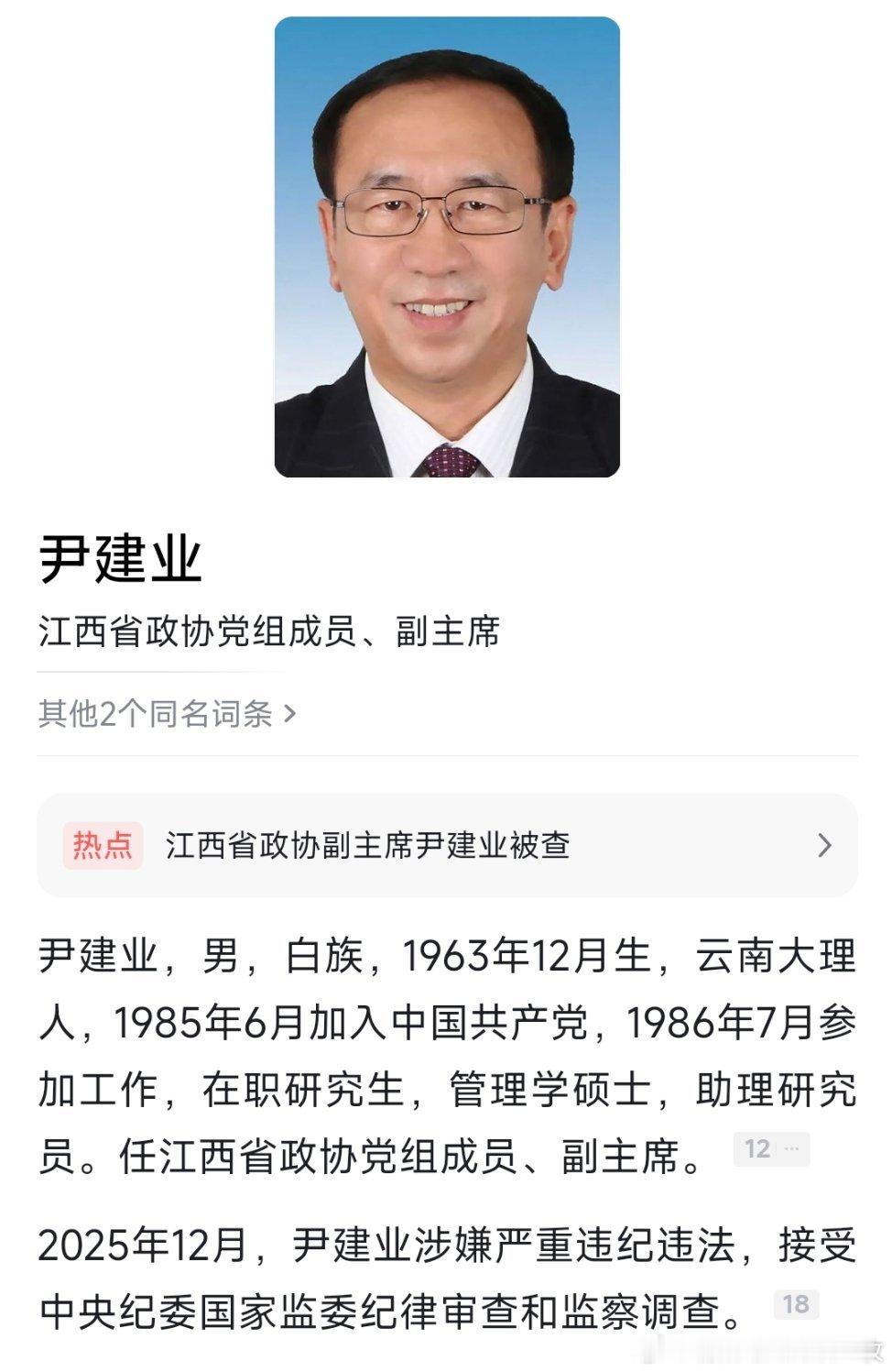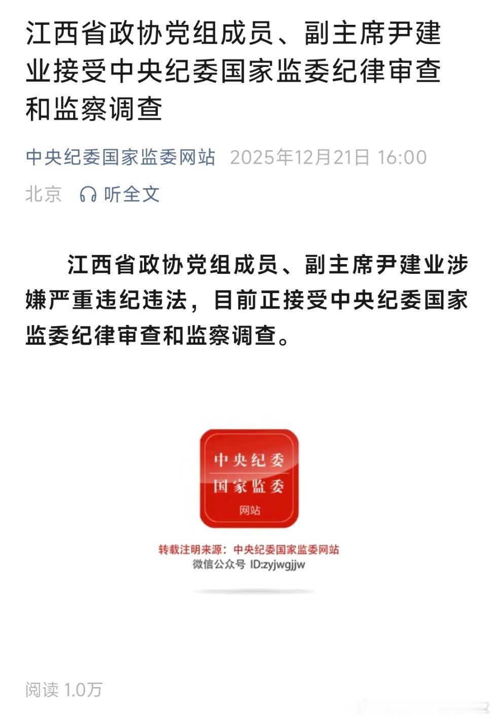 江西省政协党组成员、副主席尹建业接受中央纪委国家监委纪律审查和监察调查!