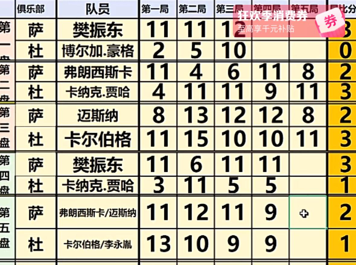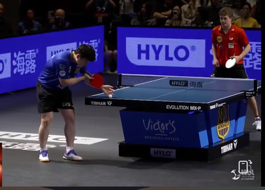 德甲焦点战萨尔布吕肯3:2杜塞尔多夫樊振东一单贡献二分 樊振东今天在赛前热身的时候, 场馆响起海阔天空, 现场观众纷纷跟着一起合唱, 现场气氛热烈! 樊振东一单 第一盘樊振东3:0豪格, 第二盘 弗朗西斯卡2:3贾哈 第三盘 迈斯格2:3卡尔伯格 第四盘樊振东3:1贾哈, 第五盘弗朗西斯卡/迈斯格3:1 卡尔伯格/李永胤 樊振东一单贡献二分, 杜塞尔多夫也是德甲第一强队, 他们今天采用了田忌赛马, 把贾哈,卡尔伯格放后面, 邱党没有出战,不过邱党在 此前的采访中表示, 愿意和樊振东打球, 是一个学习的机会, 不知道为什么邱党今天没有 被安排上场! 樊振东的德甲合约是2026年 5月30日,萨尔布吕肯的负责人表示,樊振东去留不会受到任何压力, 只要合约到期前两天通知我们就可以,当然我还是希望樊振东可以留下来,这么伟大的运动员参加德甲, 这是一种精神力量! 波尔来现场解说,太帅太专业, 德甲联赛办的非常成熟, 希望咱们国家也可以 办这种联赛,让退役国手不用 做主播,在赛场上进行博弈, 也可以把国球发扬光大!