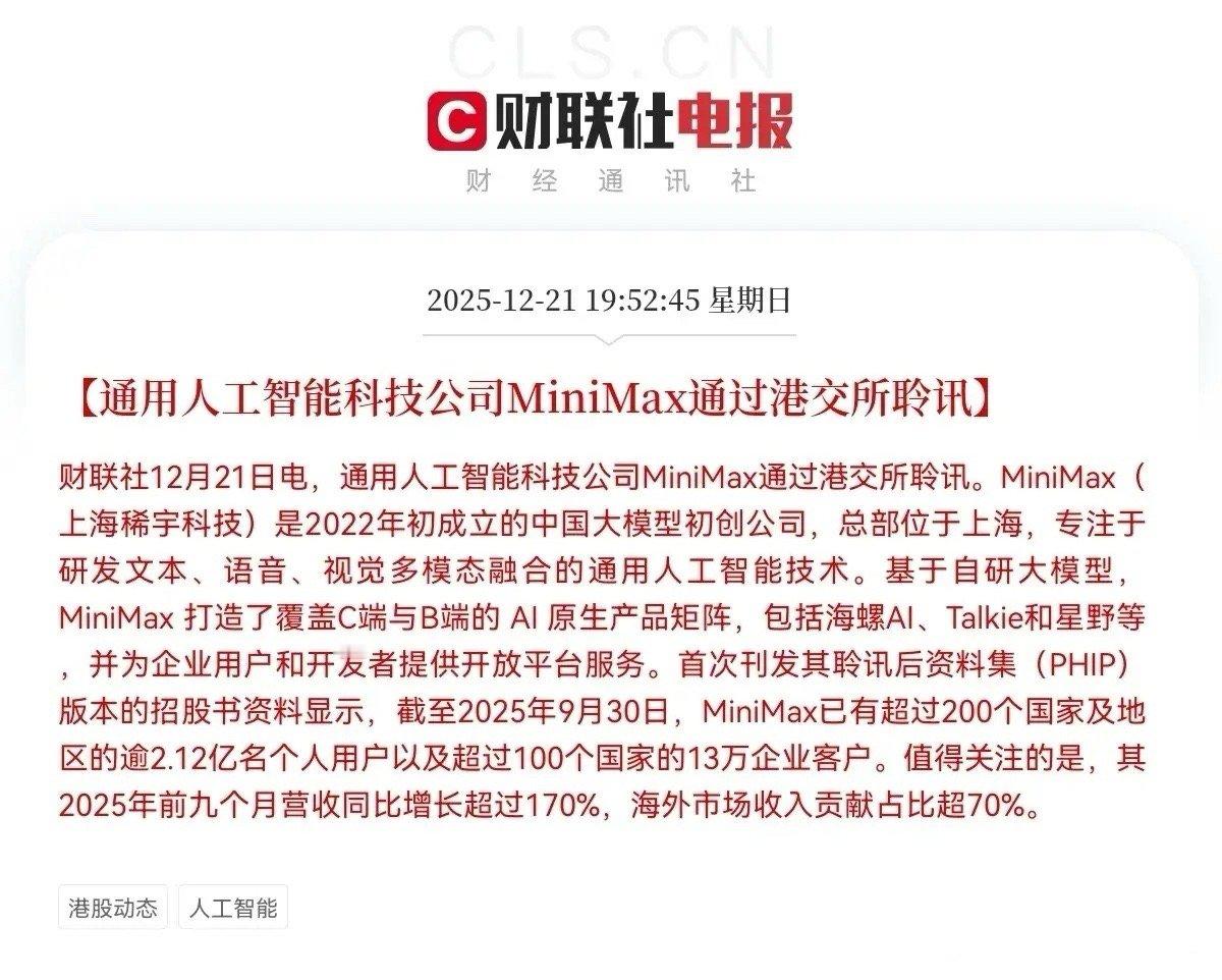 深夜又来利好了!恭喜满仓的股民们!明日AIGC概念又要火力全开了,预计要高开高走收大阳线了吧!晚间7点52分,财联社最新消息,通用人工智能科技公司MiniMax(上海稀宇科技)通过港交所聆迅,这是一家中国大模型初创公司,发展速度惊人,近三年的发展,公司业务已经遍布了超200个国家,个人客户数超2.12亿,企业客户已经超13万,海外收入非常强劲,占比已经超70%,这个消息对于AGI产业是重大利好,这标志着AI行业已经从技术探索期进入到了规模化商用期,未来具备多模态能力、垂直场景深耕能力及生态构建力的AI公司,更易获得市场认可,MiniMax若成功上市,未来甚至有可能对标OpenAI,这或许就是中国版的“OpenAI”,甚至有望冲击AGI全球第一股,中国在AGI领域的自主创新能力已经取得了重大突破,中国在全球人工智能中的竞争中又添一员猛将,这是最大的利好消息!股民们!坐稳扶好!受此利好消息影响,不出意外的话AIGC概念要起飞了!人工智能板块要起飞了