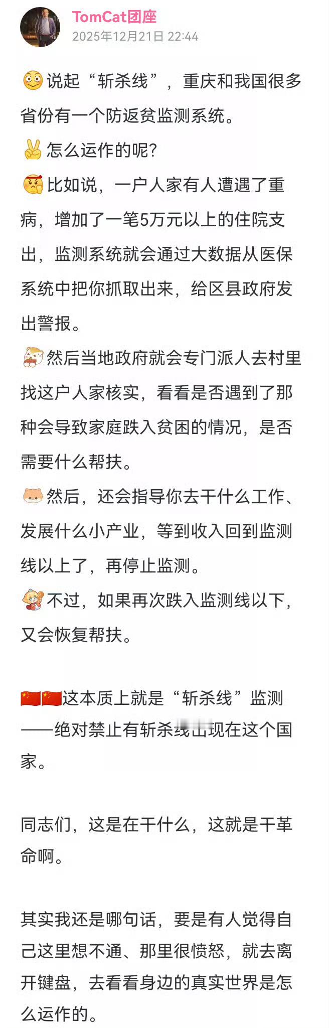 🔻网友分享:社会主义不让你跌入斩杀线以下——这个叫落实常态化防止返贫致贫机制,开展动态监测帮扶政策。🔻党和国家说:要完成消除绝对贫困的艰巨任务,于是便上下一条心行动起来,直到现行标准下9899万农村贫困人口全部脱贫,832个贫困县全部摘帽,12.8万个贫困村全部出列,区域性整体贫困得到解决,直到脱贫攻坚战取得了全面胜利。🔻接下来,牢牢守住不发生规模性返贫致贫底线,就变成了乡村振兴的底线任务。🔻这是一个又一个彪炳史册的人间奇迹。中国人创造的。热点现场网友讨论美国存在斩杀线