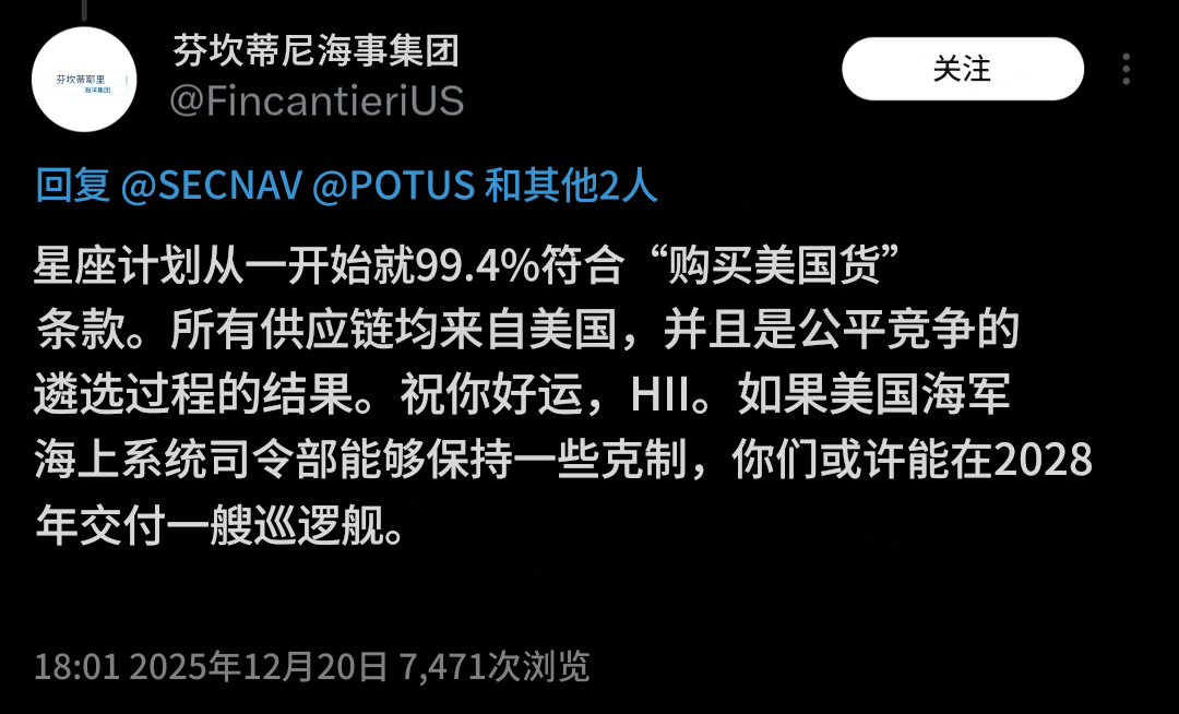 🔻网友分享:承建星座级的芬坎蒂尼美国公司不高兴了。🔻美国人评论:“哈哈这什么情况?国防部、海军和军火商在推特上打起来了,而且还抄送了特朗普总统。”🔻还有美国人评论:“换了我也要气炸:被美国海军折腾五年改了无数方案,结果他们自己定不下最终设计就突然撤单,害我失去收入来源,还得裁掉一批短期回不来的老员工。”🔻后来删掉了。热点现场海外新鲜事